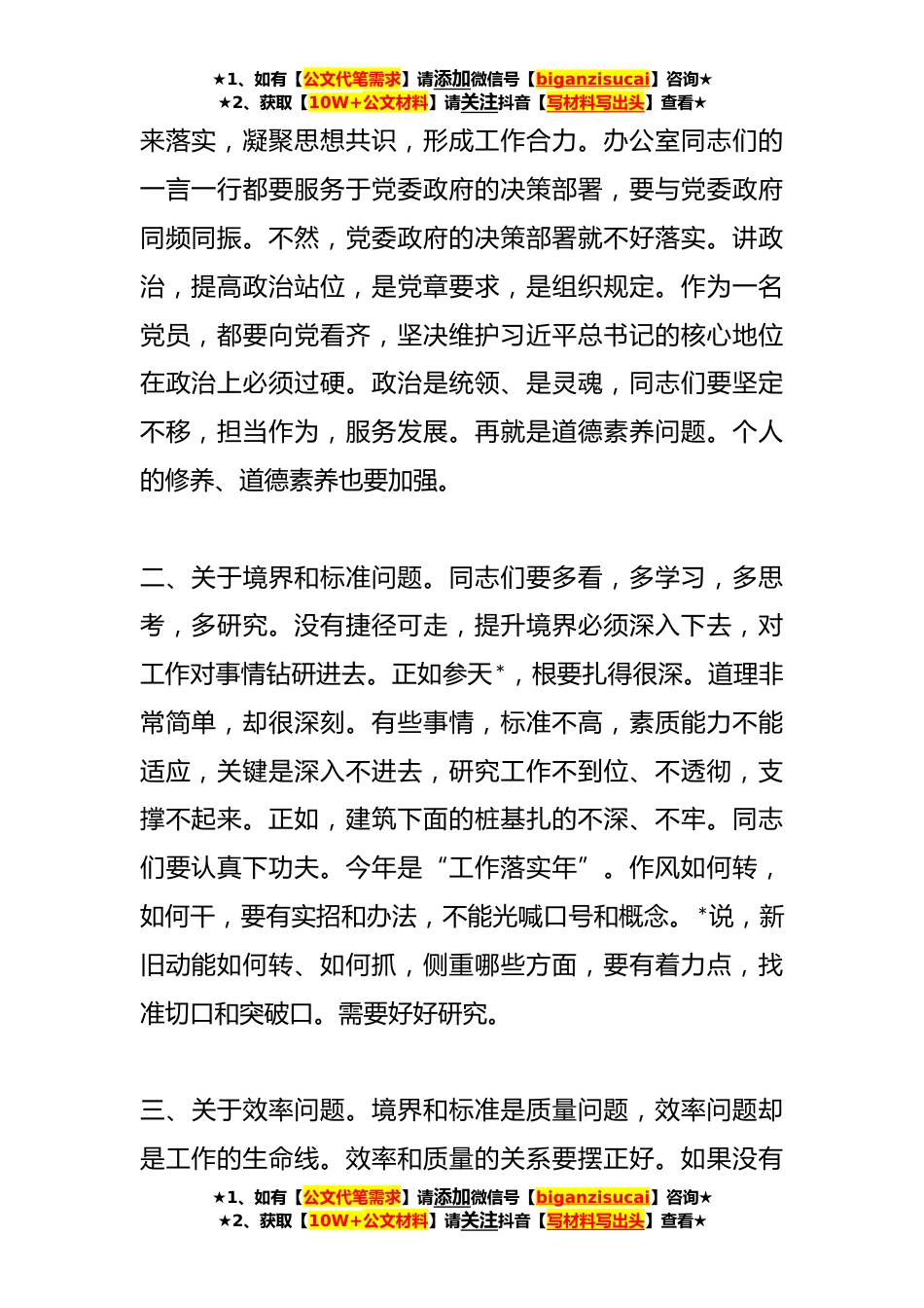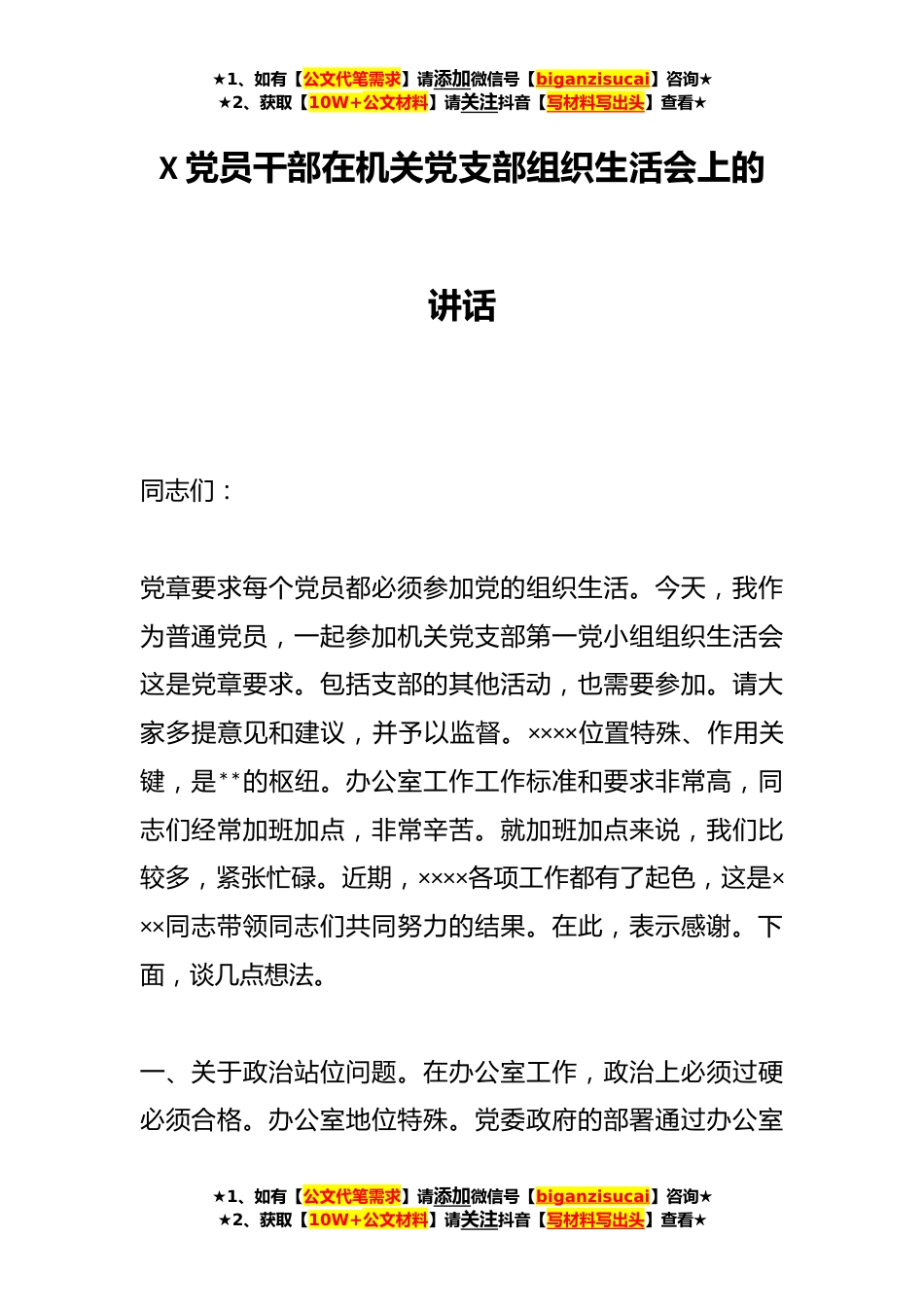 ★1、如有【公文代笔需求】请添加微信号【biganzisucai】咨询★★2、获取【10W+公文材料】请关注抖音【写材料写出头】查看★X党员干部在机关党支部组织生活会上的讲话同志们:党章要求每个党员都必须参加党的组织生活。今天,我作为普通党员,一起参加机关党支部第一党小组组织生活会这是党章要求。包括支部的其他活动,也需要参加。请大家多提意见和建议,并予以监督。××××位置特殊、作用关键,是**的枢纽。办公室工作工作标准和要求非常高,同志们经常加班加点,非常辛苦。就加班加点来说,我们比较多,紧张忙碌。近期,××××各项工作都有了起色,这是×××同志带领同志们共同努力的结果。在此,表示感谢。下面,谈几点想法。一、关于政治站位问题。在办公室工作,政治上必须过硬必须合格。办公室地位特...
