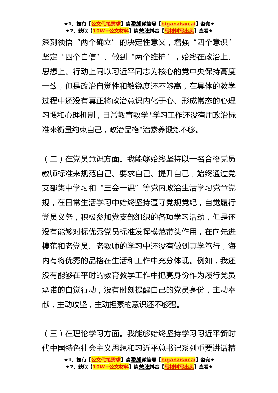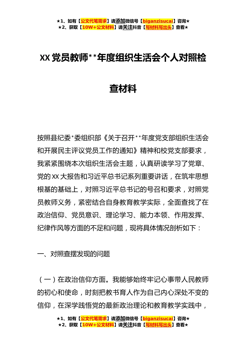 ★1、如有【公文代笔需求】请添加微信号【biganzisucai】咨询★★2、获取【10W+公文材料】请关注抖音【写材料写出头】查看★XX党员教师**年度组织生活会个人对照检查材料按照县纪委*委组织部《关于召开**年度党支部组织生活会和开展民主评议党员工作的通知》精神和校党支部要求,我紧紧围绕本次组织生活会主题,认真研读学习了党章、党的XX大报告和习近平总书记系列重要讲话,在筑牢思想根基的基础上,对照习近平总书记的号召和要求,对照党员教师义务,紧密结合自身教育教学实际,全面查找了在政治信仰、党员意识、理论学习、能力本领、作用发挥、纪律作风等方面的不足和问题,现将具体情况剖析如下:一、对照查摆发现的问题(一)在政治信仰方面。我能够始终牢记心事带人民教师的初心和使命,时刻把教书育人作为...