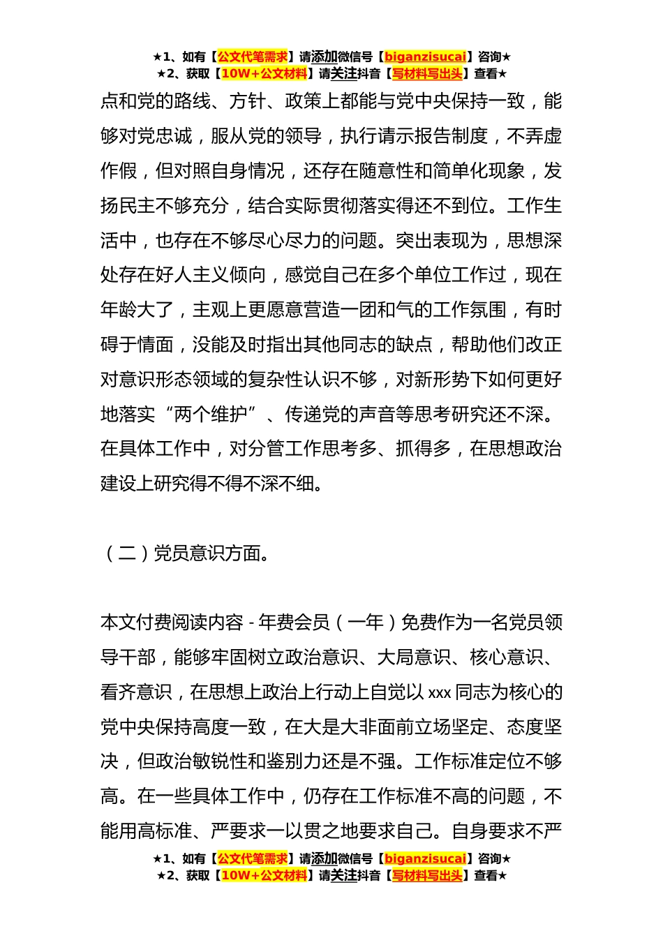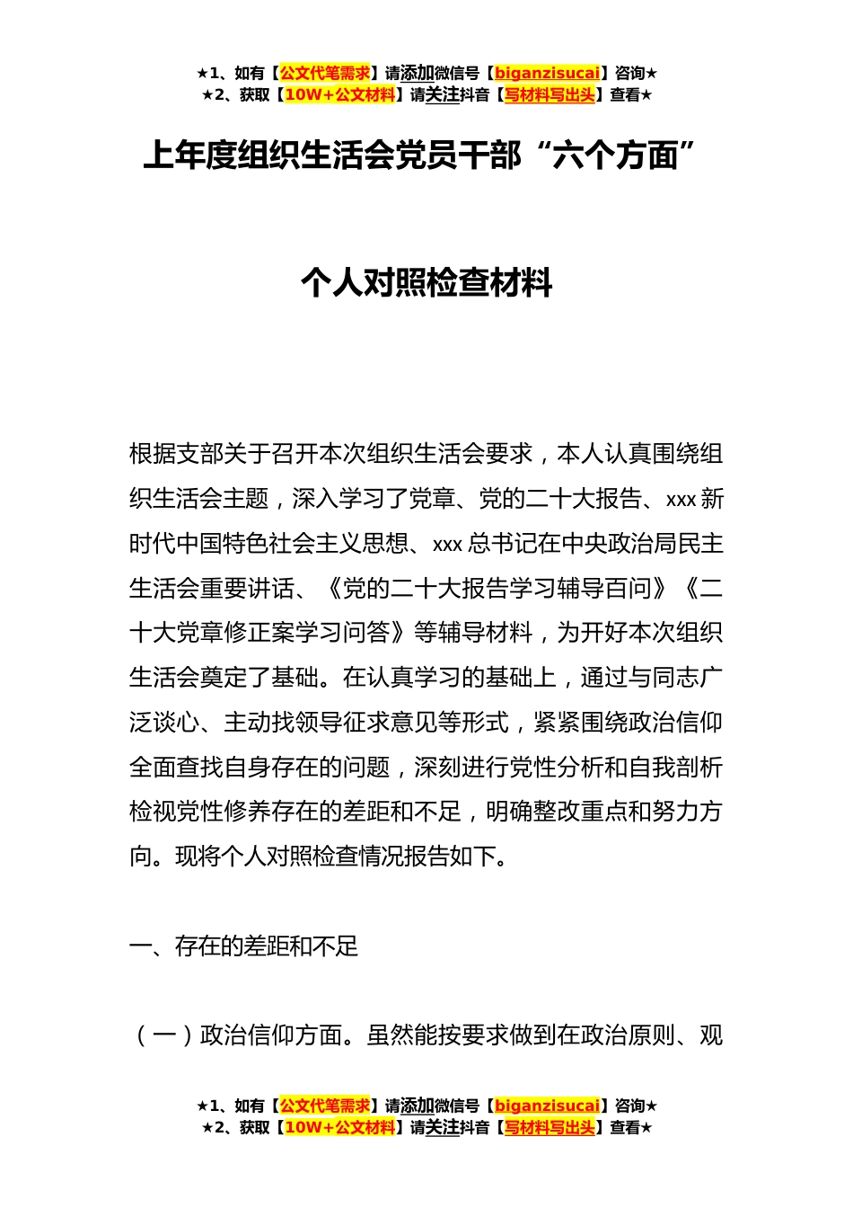 ★1、如有【公文代笔需求】请添加微信号【biganzisucai】咨询★★2、获取【10W+公文材料】请关注抖音【写材料写出头】查看★上年度组织生活会党员干部“六个方面”个人对照检查材料根据支部关于召开本次组织生活会要求,本人认真围绕组织生活会主题,深入学习了党章、党的二十大报告、xxx新时代中国特色社会主义思想、xxx总书记在中央政治局民主生活会重要讲话、《党的二十大报告学习辅导百问》《二十大党章修正案学习问答》等辅导材料,为开好本次组织生活会奠定了基础。在认真学习的基础上,通过与同志广泛谈心、主动找领导征求意见等形式,紧紧围绕政治信仰全面查找自身存在的问题,深刻进行党性分析和自我剖析检视党性修养存在的差距和不足,明确整改重点和努力方向。现将个人对照检查情况报告如下。一、存在...