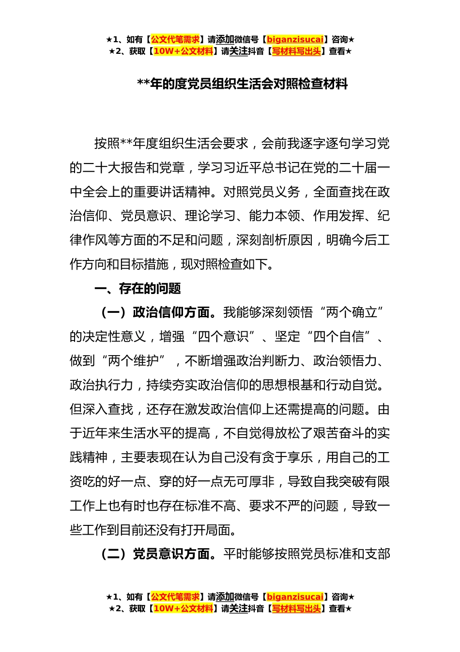 ★1、如有【公文代笔需求】请添加微信号【biganzisucai】咨询★★2、获取【10W+公文材料】请关注抖音【写材料写出头】查看★**年的度党员组织生活会对照检查材料按照**年度组织生活会要求,会前我逐字逐句学习党的二十大报告和党章,学习习近平总书记在党的二十届一中全会上的重要讲话精神。对照党员义务,全面查找在政治信仰、党员意识、理论学习、能力本领、作用发挥、纪律作风等方面的不足和问题,深刻剖析原因,明确今后工作方向和目标措施,现对照检查如下。一、存在的问题(一)政治信仰方面。我能够深刻领悟“两个确立”的决定性意义,增强“四个意识”、坚定“四个自信”、做到“两个维护”,不断增强政治判断力、政治领悟力、政治执行力,持续夯实政治信仰的思想根基和行动自觉。但深入查找,还存在激发...