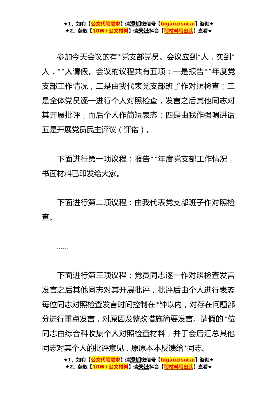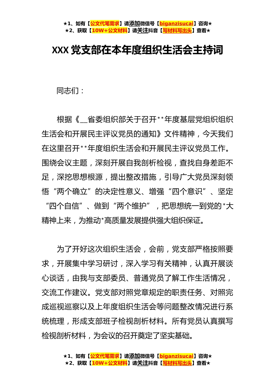 ★1、如有【公文代笔需求】请添加微信号【biganzisucai】咨询★★2、获取【10W+公文材料】请关注抖音【写材料写出头】查看★XXX党支部在本年度组织生活会主持词同志们:根据《__省委组织部关于召开**年度基层党组织组织生活会和开展民主评议党员的通知》文件精神,今天我们在这里召开**年度组织生活会和开展民主评议党员工作。围绕会议主题,深刻开展自我剖析检视,查找自身差距不足,深挖思想根源,提出整改措施,引导广大党员深刻领悟“两个确立”的决定性意义、增强“四个意识”、坚定“四个自信”、做到“两个维护”,把思想统一到党的*大精神上来,为推动*高质量发展提供强大组织保证。为了开好这次组织生活会,会前,党支部严格按照要求,开展集中学习研讨,深入学习有关精神,认真开展谈心谈话,由我与支部...