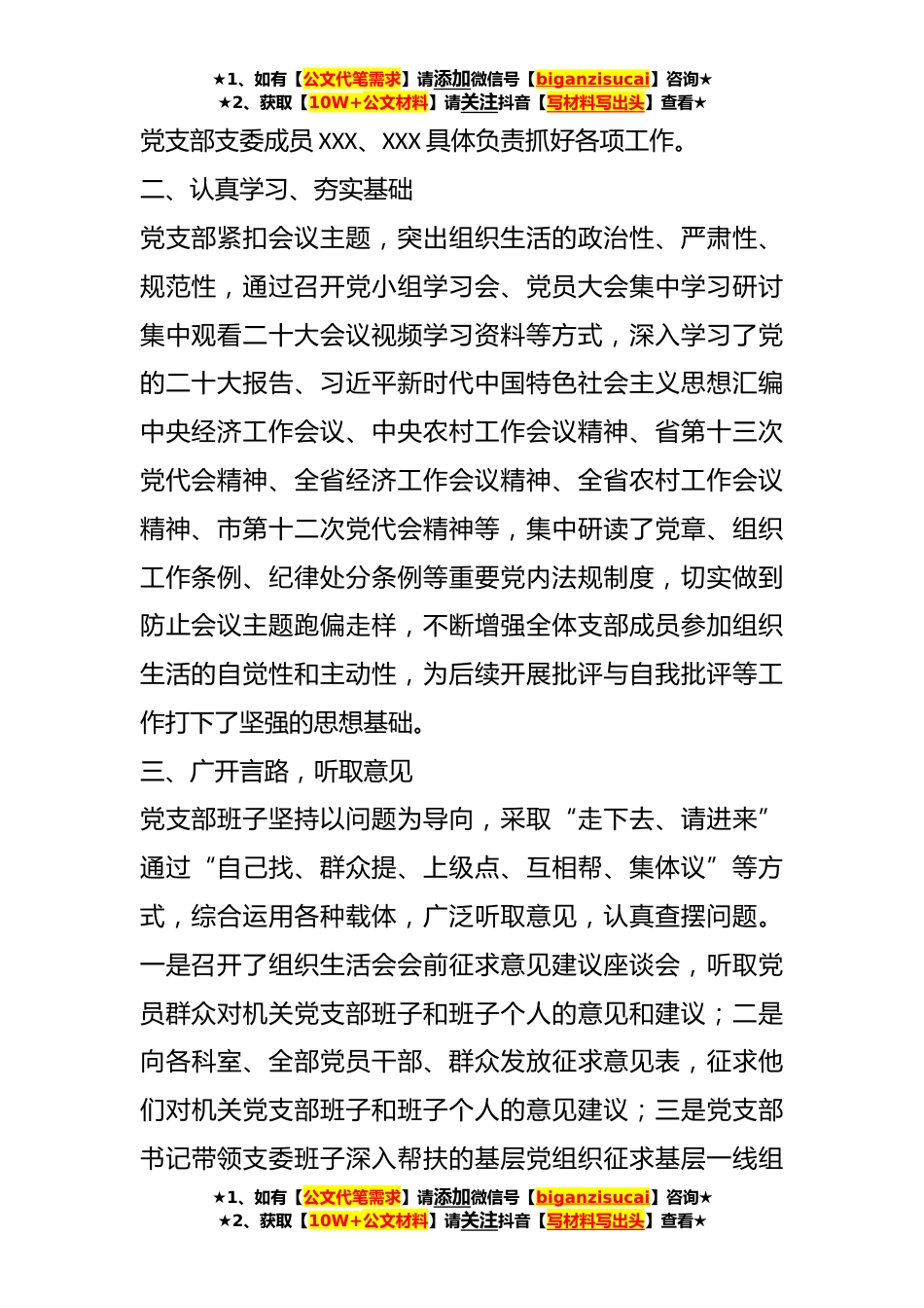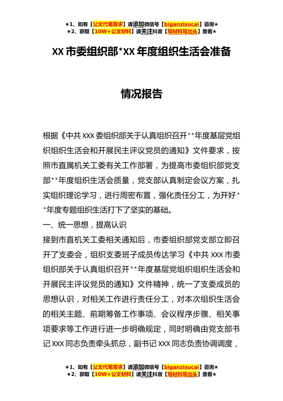 ★1、如有【公文代笔需求】请添加微信号【biganzisucai】咨询★★2、获取【10W+公文材料】请关注抖音【写材料写出头】查看★XX市委组织部*XX年度组织生活会准备情况报告根据《中共XXX委组织部关于认真组织召开**年度基层党组织组织生活会和开展民主评议党员的通知》文件要求,按照市直属机关工委有关工作部署,为提高市委组织部党支部**年度组织生活会质量,党支部认真制定会议方案,扎实组织理论学习,进行周密布置,强化责任分工,为开好**年度专题组织生活打下了坚实的基础。一、统一思想,提高认识接到市直机关工委相关通知后,市委组织部党支部立即召开了支委会,组织支委班子成员传达学习《中共XXX市委组织部关于认真组织召开**年度基层党组织组织生活会和开展民主评议党员的通知》文件精神,统一了支委成员...