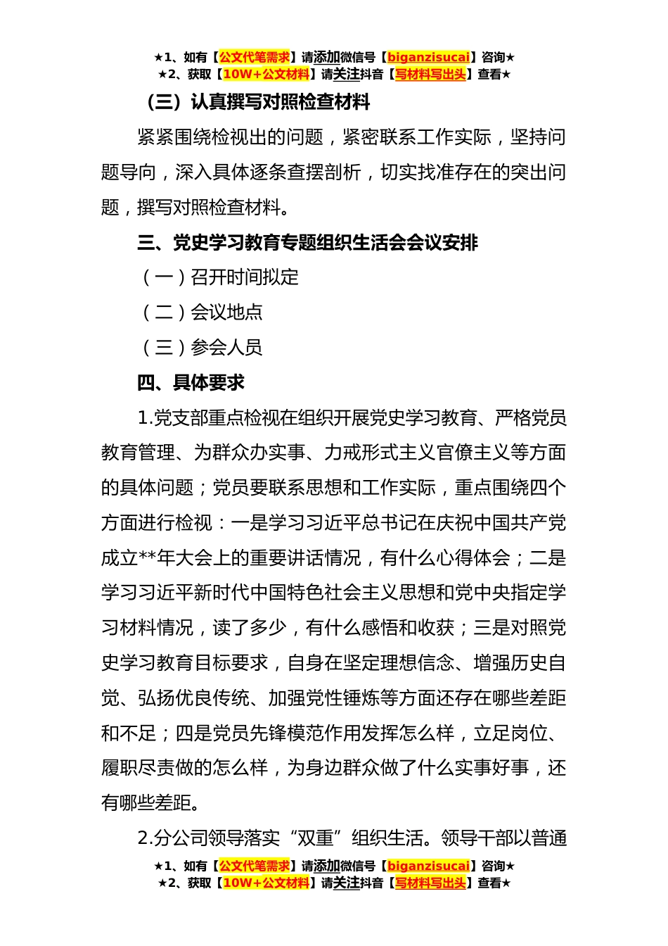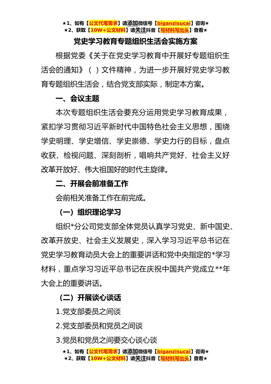 ★1、如有【公文代笔需求】请添加微信号【biganzisucai】咨询★★2、获取【10W+公文材料】请关注抖音【写材料写出头】查看★党史学习教育专题组织生活会实施方案根据党委《关于在党史学习教育中开展好专题组织生活会的通知》()文件精神,为进一步开展好党史学习教育专题组织生活会,结合党支部实际,制定本方案。一、会议主题本次专题组织生活会要充分运用党史学习教育成果,紧扣学习贯彻习近平新时代中国特色社会主义思想,围绕学史明理、学史增信、学史崇德、学史力行的目标,盘点收获、检视问题、深刻剖析,唱响共产党好、社会主义好改革开放好、伟大祖国好的时代主旋律。二、开展会前准备工作会前相关准备工作在前完成。(一)组织理论学习组织*分公司党支部全体党员认真学习党史、新中国史、改革开放史、社...