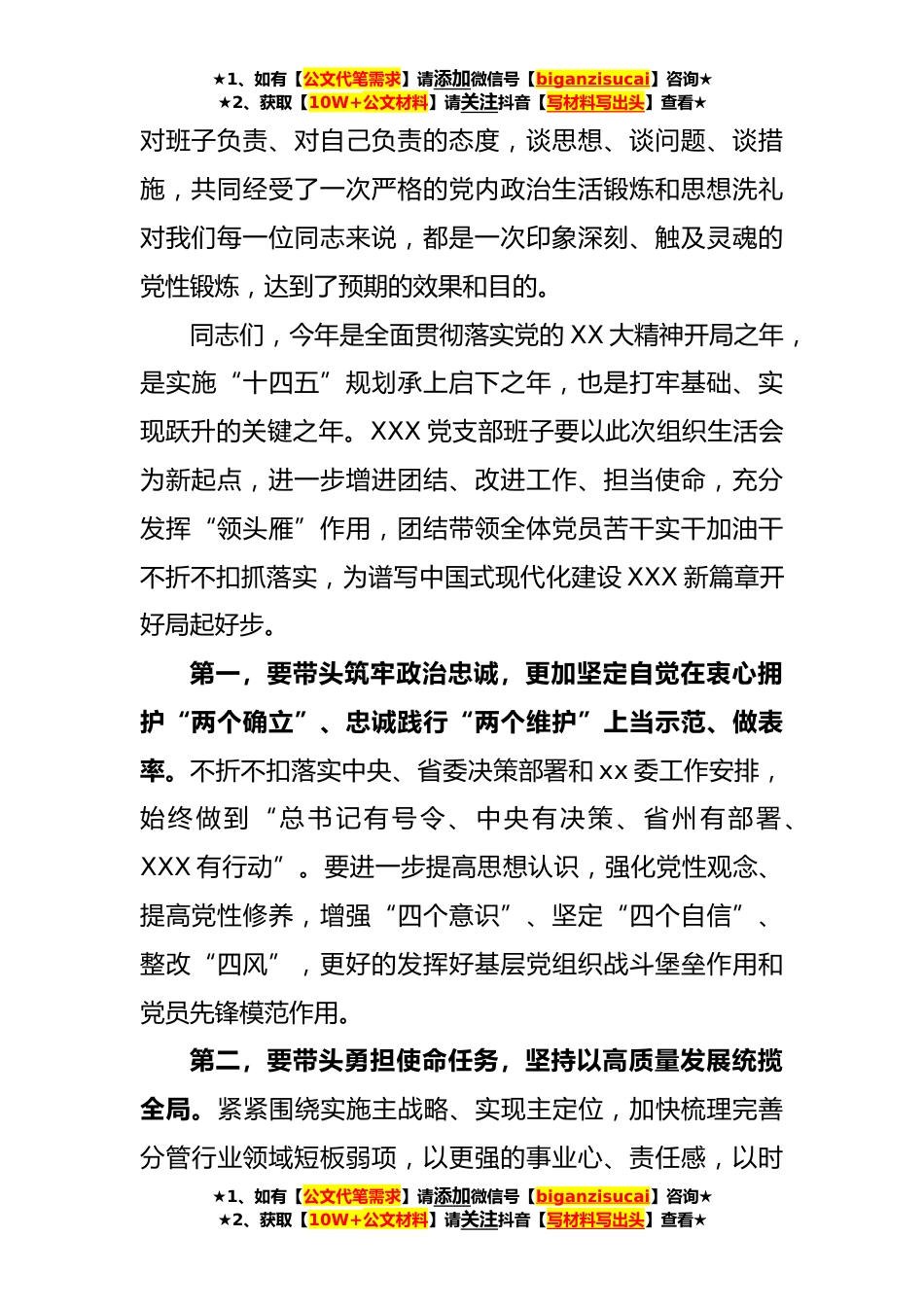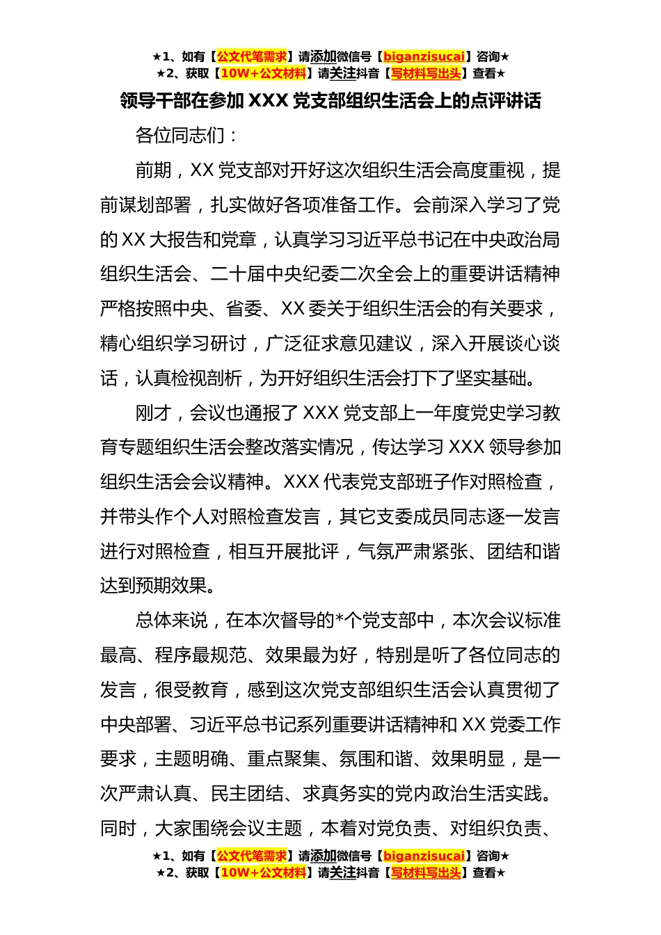 ★1、如有【公文代笔需求】请添加微信号【biganzisucai】咨询★★2、获取【10W+公文材料】请关注抖音【写材料写出头】查看★领导干部在参加XXX党支部组织生活会上的点评讲话各位同志们:前期,XX党支部对开好这次组织生活会高度重视,提前谋划部署,扎实做好各项准备工作。会前深入学习了党的XX大报告和党章,认真学习习近平总书记在中央政治局组织生活会、二十届中央纪委二次全会上的重要讲话精神严格按照中央、省委、XX委关于组织生活会的有关要求,精心组织学习研讨,广泛征求意见建议,深入开展谈心谈话,认真检视剖析,为开好组织生活会打下了坚实基础。刚才,会议也通报了XXX党支部上一年度党史学习教育专题组织生活会整改落实情况,传达学习XXX领导参加组织生活会会议精神。XXX代表党支部班子作对照检查,...