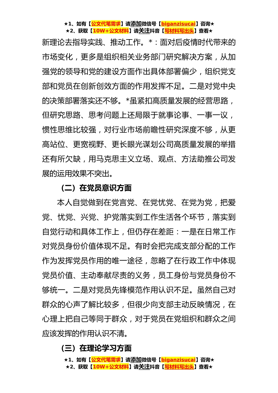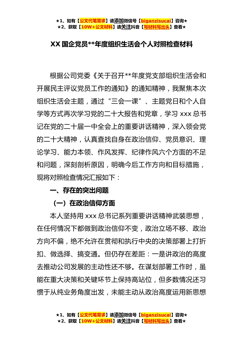 ★1、如有【公文代笔需求】请添加微信号【biganzisucai】咨询★★2、获取【10W+公文材料】请关注抖音【写材料写出头】查看★XX国企党员**年度组织生活会个人对照检查材料根据公司党委《关于召开**年度党支部组织生活会和开展民主评议党员工作的通知》的通知精神,我聚焦本次组织生活会主题,通过“三会一课”、主题党日和个人自学等方式再次学习党的二十大报告和党章,学习xxx总书记在党的二十届一中全会上的重要讲话精神,深入领会党的二十大精神,认真查找自身在政治信仰、党员意识、理论学习、能力本领、作风发挥、纪律作风六个方面的不足和问题,深刻剖析原因,明确今后工作方向和目标措施,现将对照检查情况汇报如下:一、存在的突出问题(一)在政治信仰方面本人坚持用xxx总书记系列重要讲话精神武装思想,...