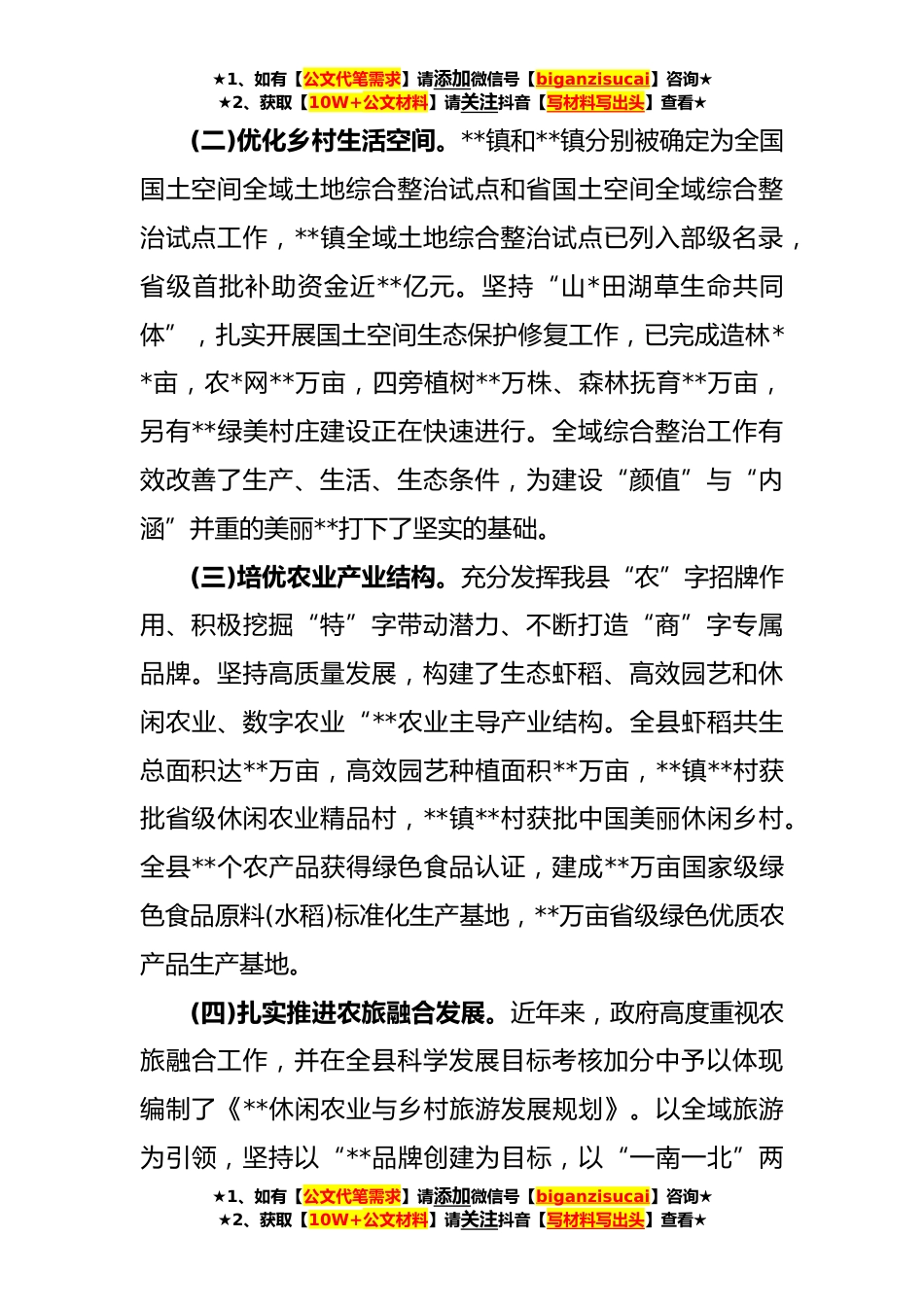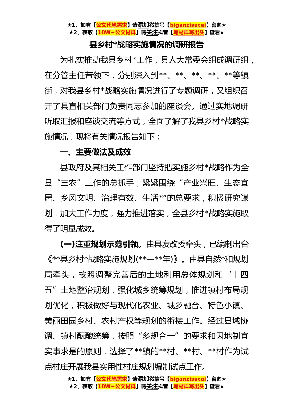 ★1、如有【公文代笔需求】请添加微信号【biganzisucai】咨询★★2、获取【10W+公文材料】请关注抖音【写材料写出头】查看★县乡村*战略实施情况的调研报告为扎实推动我县乡村*工作,县人大常委会组成调研组,在分管主任带领下,分别深入到**、**、**、**、**等镇街,对我县乡村*战略实施情况进行了专题调研,又组织召开了县直相关部门负责同志参加的座谈会。通过实地调研听取汇报和座谈交流等方式,全面了解了我县乡村*战略实施情况,现将有关情况报告如下:一、主要做法及成效县政府及其相关工作部门坚持把实施乡村*战略作为全县“三农”工作的总抓手,紧紧围绕“产业兴旺、生态宜居、乡风文明、治理有效、生活*”的总要求,积极研究谋划,加大工作力度,强力推进落实,全县乡村*战略实施取得了明显成效。(一)注...