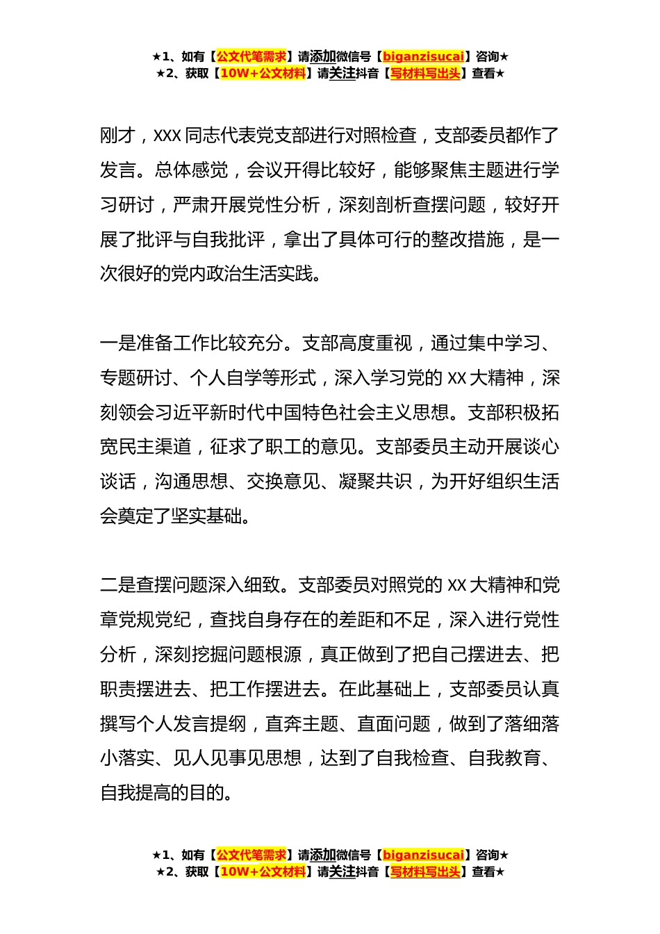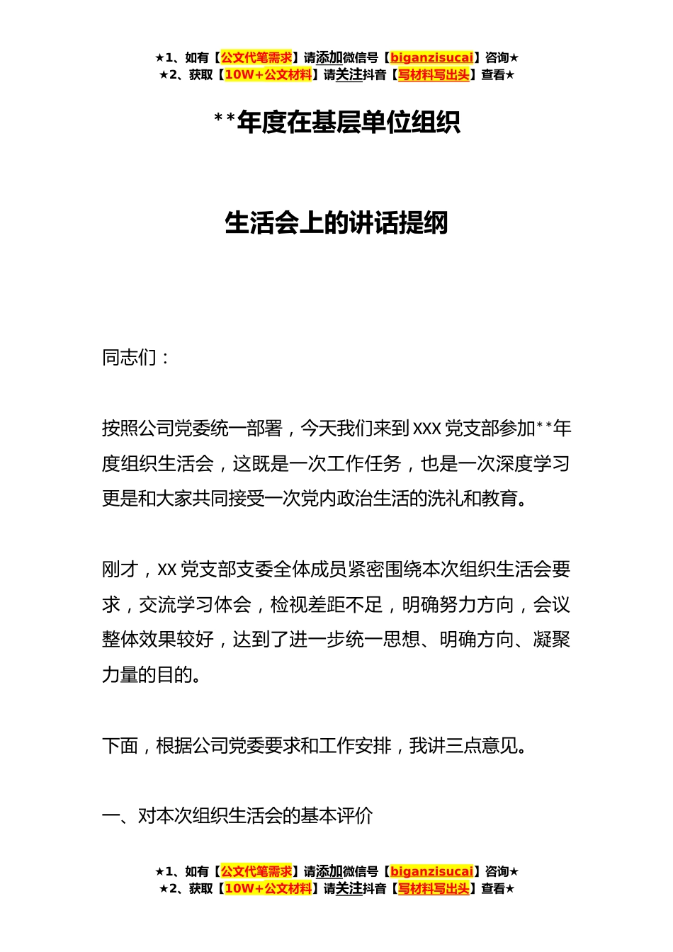 ★1、如有【公文代笔需求】请添加微信号【biganzisucai】咨询★★2、获取【10W+公文材料】请关注抖音【写材料写出头】查看★**年度在基层单位组织生活会上的讲话提纲同志们:按照公司党委统一部署,今天我们来到XXX党支部参加**年度组织生活会,这既是一次工作任务,也是一次深度学习更是和大家共同接受一次党内政治生活的洗礼和教育。刚才,XX党支部支委全体成员紧密围绕本次组织生活会要求,交流学习体会,检视差距不足,明确努力方向,会议整体效果较好,达到了进一步统一思想、明确方向、凝聚力量的目的。下面,根据公司党委要求和工作安排,我讲三点意见。一、对本次组织生活会的基本评价★1、如有【公文代笔需求】请添加微信号【biganzisucai】咨询★★2、获取【10W+公文材料】请关注抖音【写材料写出头】查...