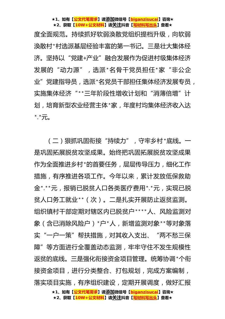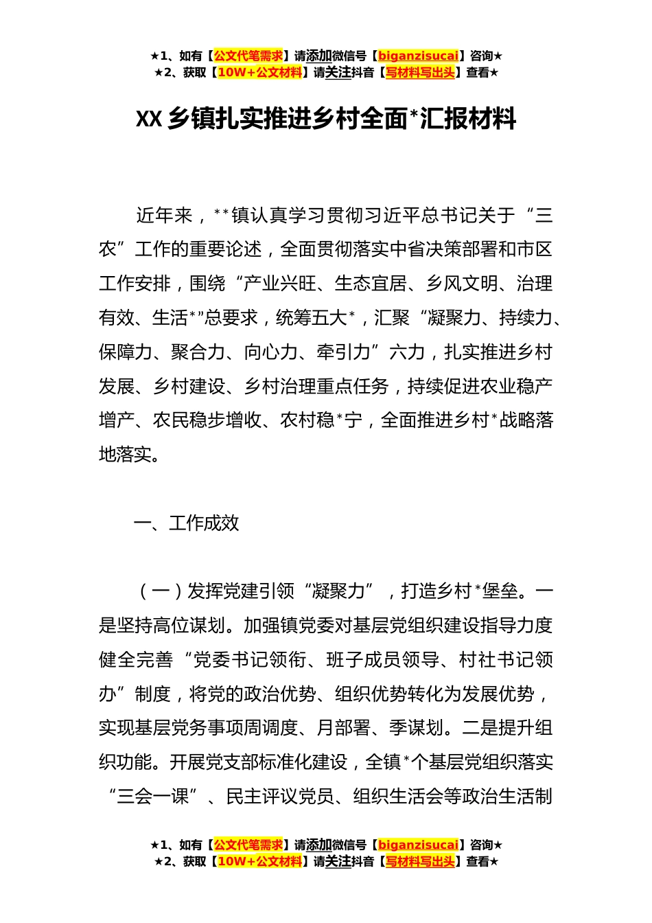 ★1、如有【公文代笔需求】请添加微信号【biganzisucai】咨询★★2、获取【10W+公文材料】请关注抖音【写材料写出头】查看★XX乡镇扎实推进乡村全面*汇报材料近年来,**镇认真学习贯彻习近平总书记关于“三农”工作的重要论述,全面贯彻落实中省决策部署和市区工作安排,围绕“产业兴旺、生态宜居、乡风文明、治理有效、生活*”总要求,统筹五大*,汇聚“凝聚力、持续力、保障力、聚合力、向心力、牵引力”六力,扎实推进乡村发展、乡村建设、乡村治理重点任务,持续促进农业稳产增产、农民稳步增收、农村稳*宁,全面推进乡村*战略落地落实。一、工作成效(一)发挥党建引领“凝聚力”,打造乡村*堡垒。一是坚持高位谋划。加强镇党委对基层党组织建设指导力度健全完善“党委书记领衔、班子成员领导、村社书记领办...