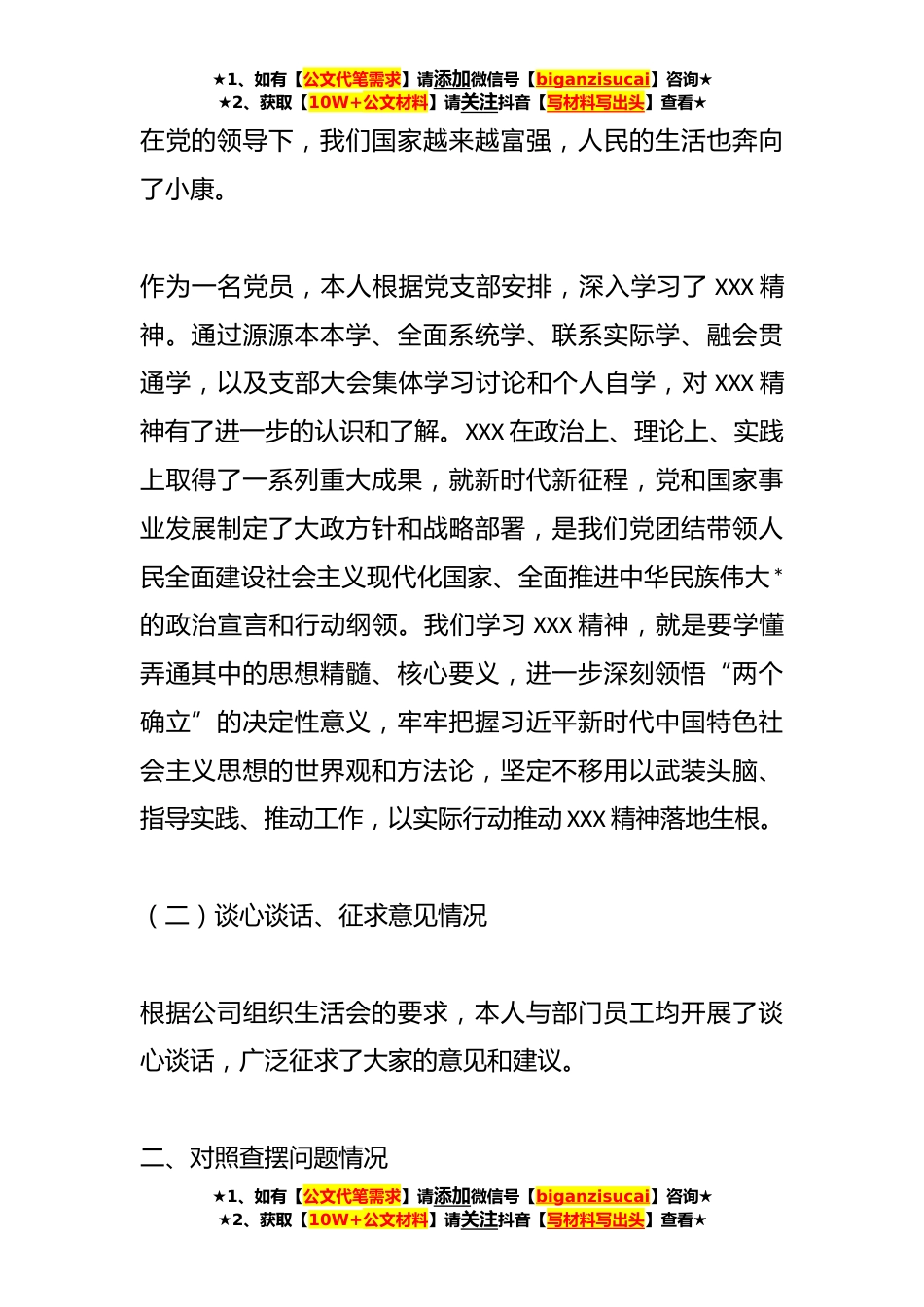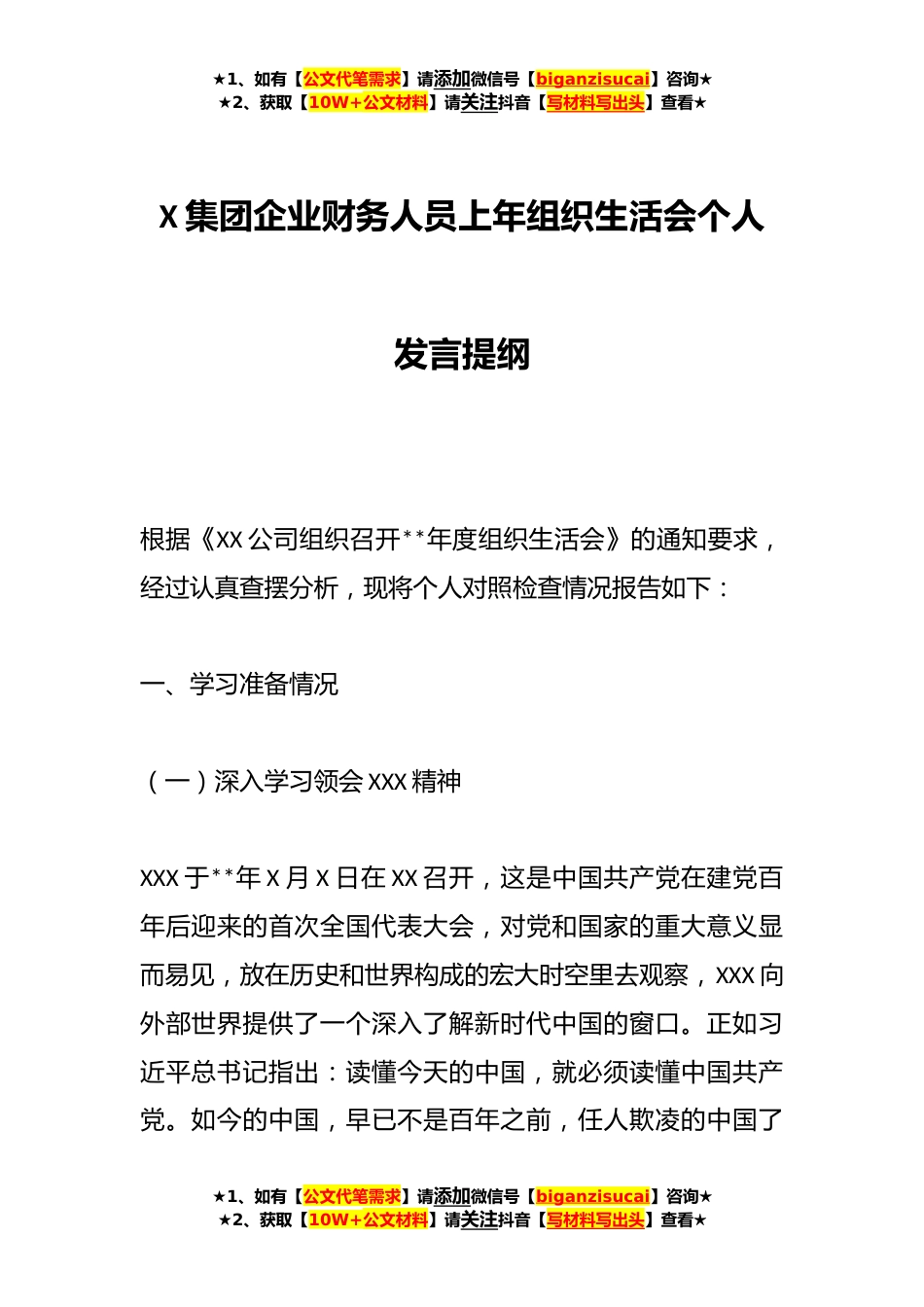 ★1、如有【公文代笔需求】请添加微信号【biganzisucai】咨询★★2、获取【10W+公文材料】请关注抖音【写材料写出头】查看★X集团企业财务人员上年组织生活会个人发言提纲根据《XX公司组织召开**年度组织生活会》的通知要求,经过认真查摆分析,现将个人对照检查情况报告如下:一、学习准备情况(一)深入学习领会XXX精神XXX于**年X月X日在XX召开,这是中国共产党在建党百年后迎来的首次全国代表大会,对党和国家的重大意义显而易见,放在历史和世界构成的宏大时空里去观察,XXX向外部世界提供了一个深入了解新时代中国的窗口。正如习近平总书记指出:读懂今天的中国,就必须读懂中国共产党。如今的中国,早已不是百年之前,任人欺凌的中国了★1、如有【公文代笔需求】请添加微信号【biganzisucai】咨询★★2、获...