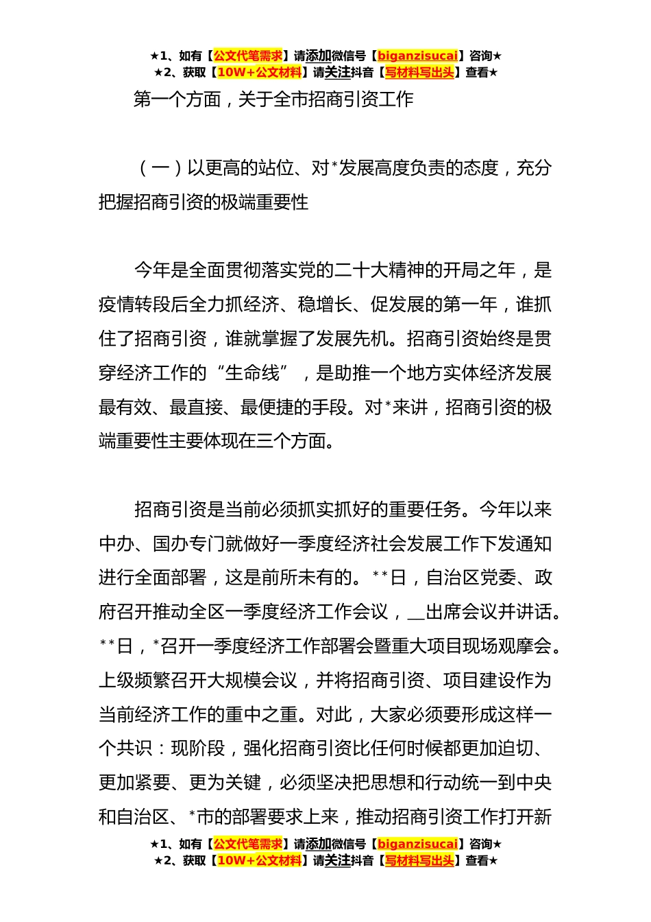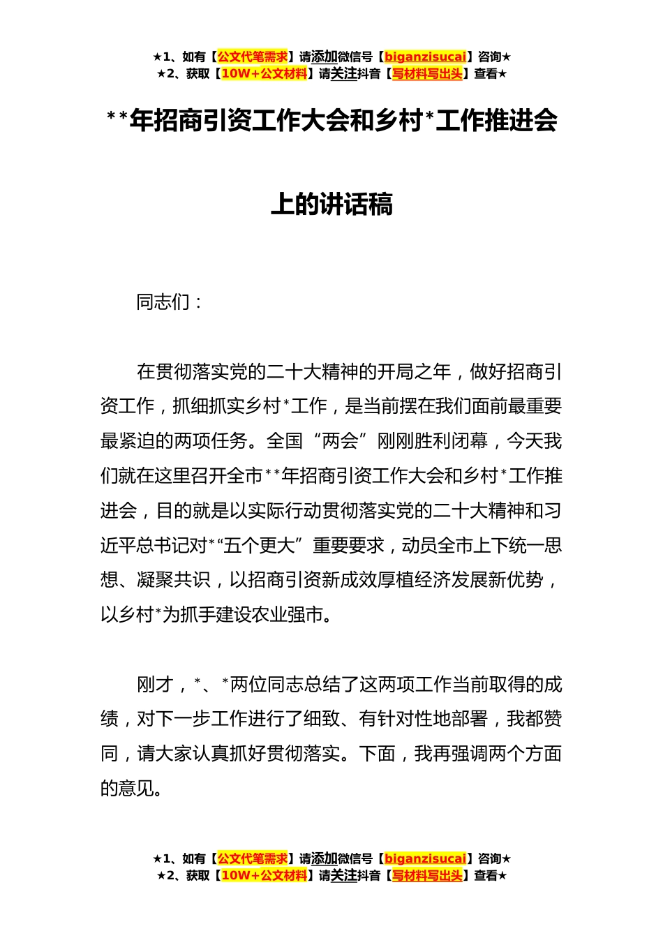 ★1、如有【公文代笔需求】请添加微信号【biganzisucai】咨询★★2、获取【10W+公文材料】请关注抖音【写材料写出头】查看★**年招商引资工作大会和乡村*工作推进会上的讲话稿同志们:在贯彻落实党的二十大精神的开局之年,做好招商引资工作,抓细抓实乡村*工作,是当前摆在我们面前最重要最紧迫的两项任务。全国“两会”刚刚胜利闭幕,今天我们就在这里召开全市**年招商引资工作大会和乡村*工作推进会,目的就是以实际行动贯彻落实党的二十大精神和习近平总书记对*“五个更大”重要要求,动员全市上下统一思想、凝聚共识,以招商引资新成效厚植经济发展新优势,以乡村*为抓手建设农业强市。刚才,*、*两位同志总结了这两项工作当前取得的成绩,对下一步工作进行了细致、有针对性地部署,我都赞同,请大家认真抓好...