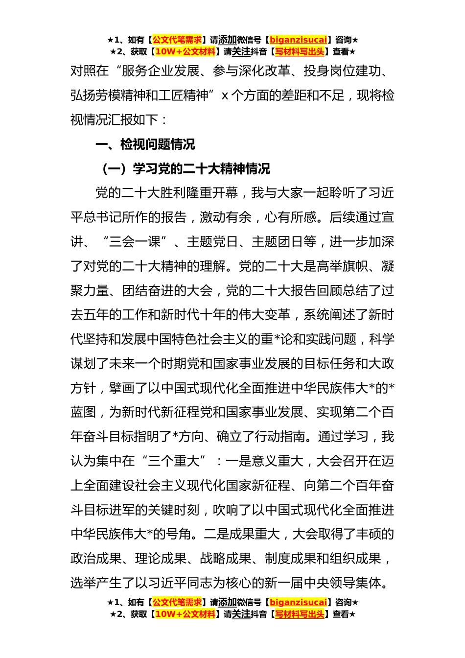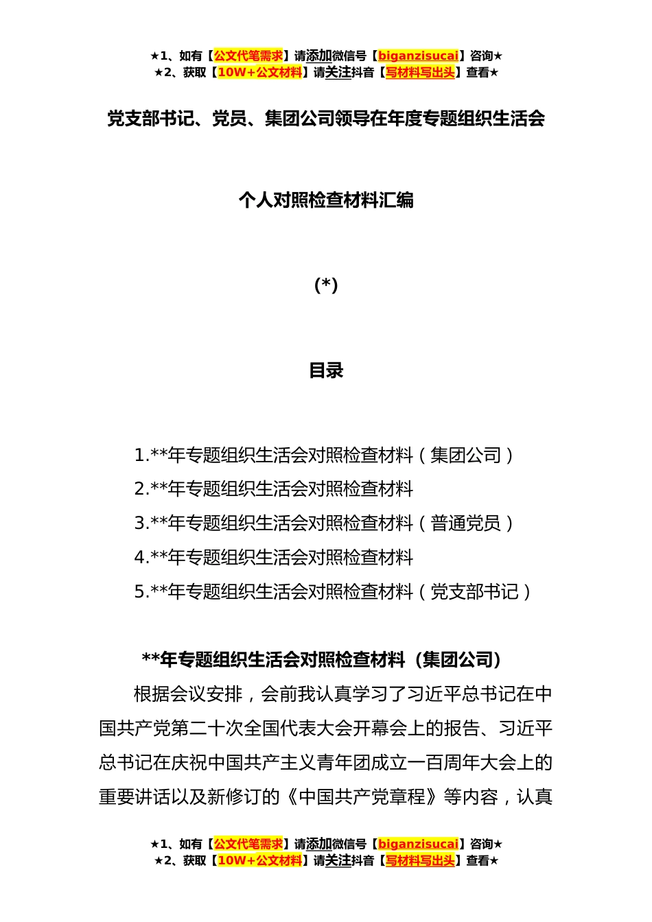 ★1、如有【公文代笔需求】请添加微信号【biganzisucai】咨询★★2、获取【10W+公文材料】请关注抖音【写材料写出头】查看★党支部书记、党员、集团公司领导在年度专题组织生活会个人对照检查材料汇编(*)目录1.**年专题组织生活会对照检查材料(集团公司)2.**年专题组织生活会对照检查材料3.**年专题组织生活会对照检查材料(普通党员)4.**年专题组织生活会对照检查材料5.**年专题组织生活会对照检查材料(党支部书记)**年专题组织生活会对照检查材料(集团公司)根据会议安排,会前我认真学习了习近平总书记在中国共产党第二十次全国代表大会开幕会上的报告、习近平总书记在庆祝中国共产主义青年团成立一百周年大会上的重要讲话以及新修订的《中国共产党章程》等内容,认真★1、如有【公文代笔需求】请添加...
