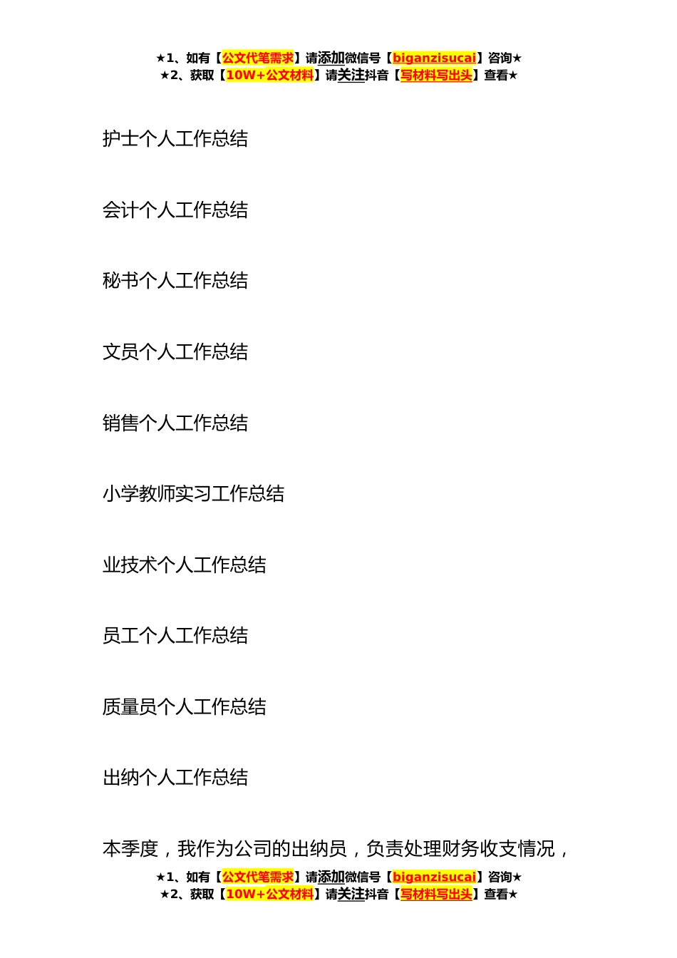 ★1、如有【公文代笔需求】请添加微信号【biganzisucai】咨询★★2、获取【10W+公文材料】请关注抖音【写材料写出头】查看★年度个人工作总结汇编(含出纳、村干部、党务、护士、会计、秘书、文员、销售、小学教师、专业技术、员工、质量员)(*篇)目录:出纳个人工作总结村干部个人工作总结党务个人工作总结★1、如有【公文代笔需求】请添加微信号【biganzisucai】咨询★★2、获取【10W+公文材料】请关注抖音【写材料写出头】查看★★1、如有【公文代笔需求】请添加微信号【biganzisucai】咨询★★2、获取【10W+公文材料】请关注抖音【写材料写出头】查看★护士个人工作总结会计个人工作总结秘书个人工作总结文员个人工作总结销售个人工作总结小学教师实习工作总结业技术个人工作总结员工个人工作总结质量员个人工作...