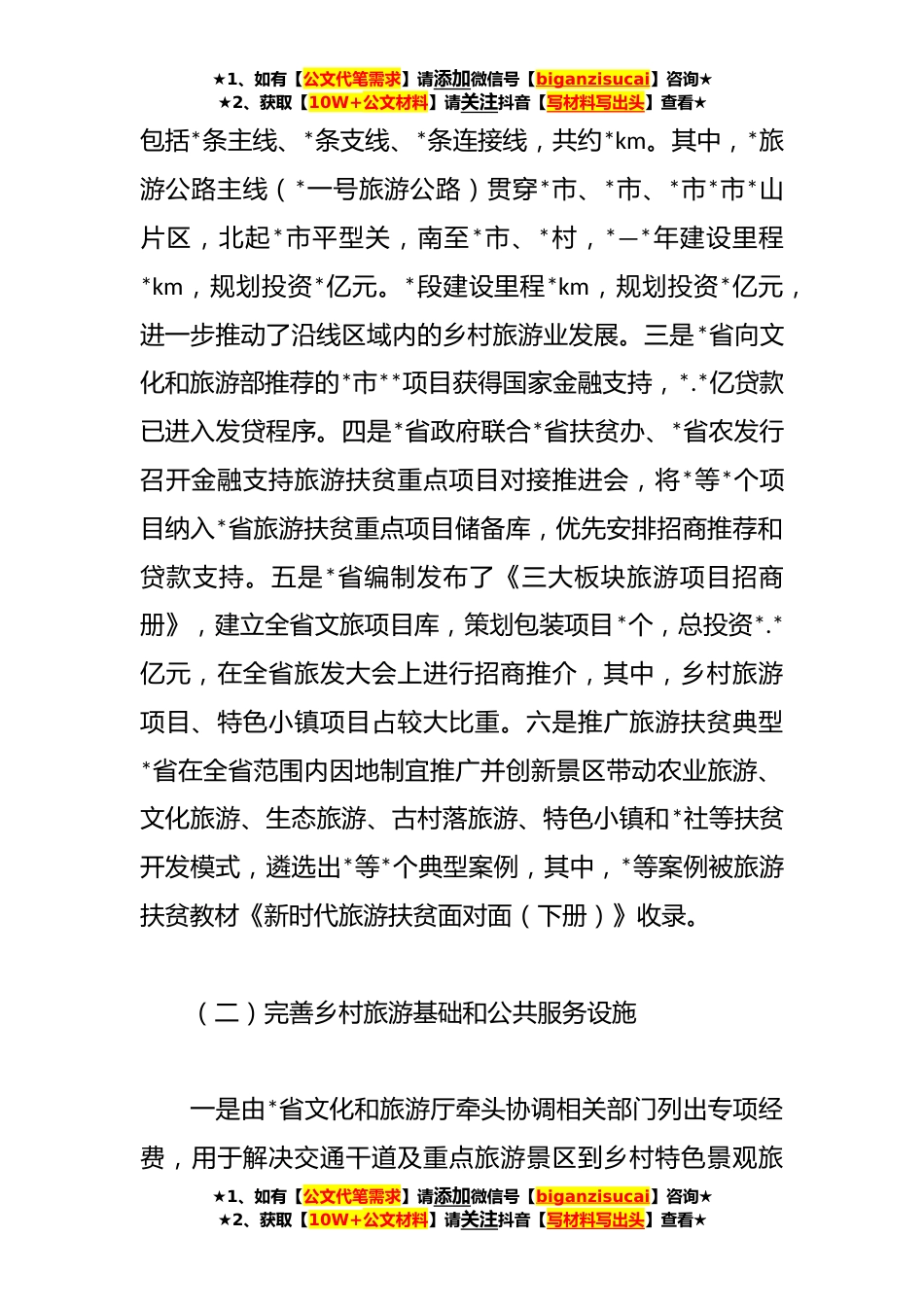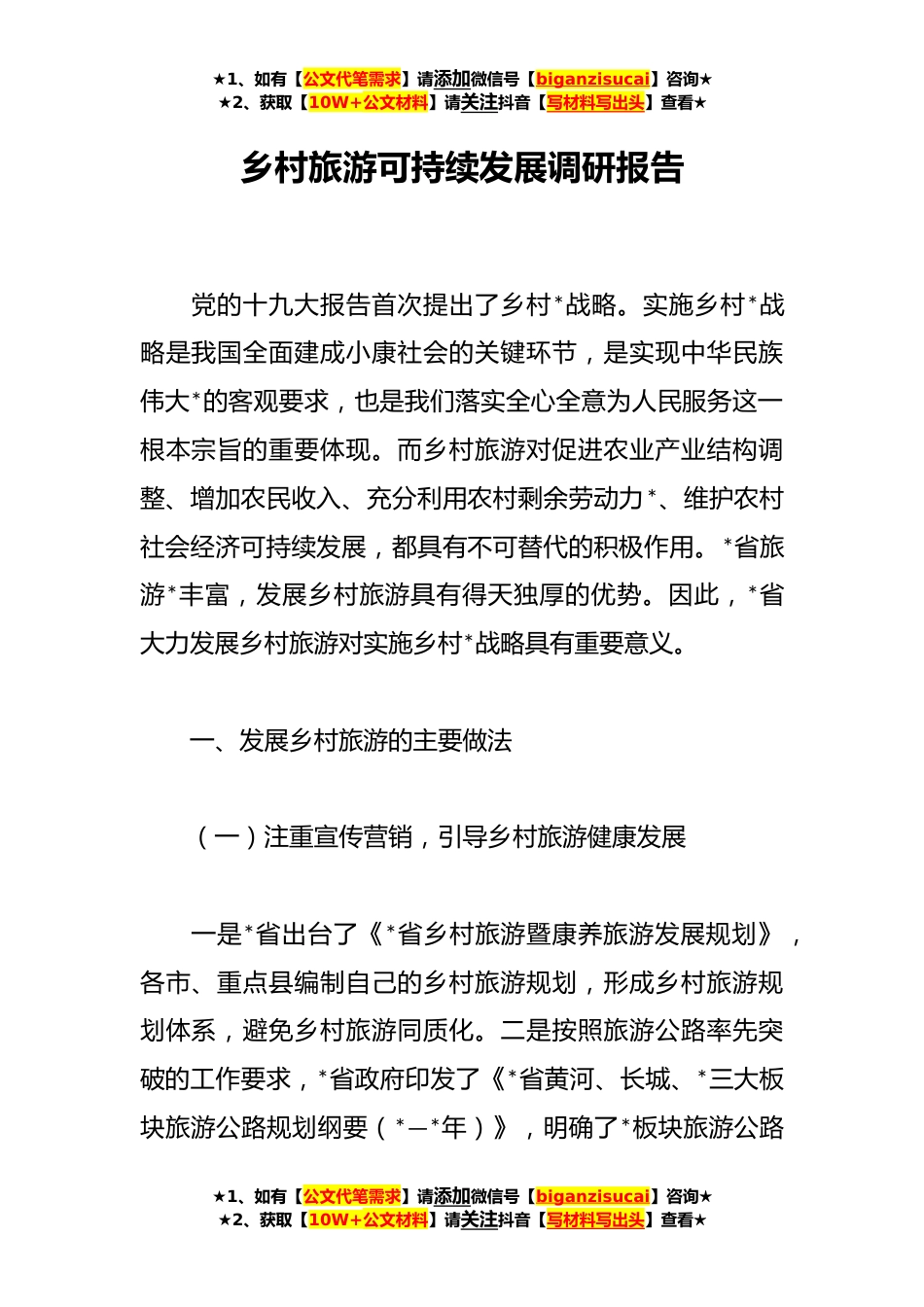 ★1、如有【公文代笔需求】请添加微信号【biganzisucai】咨询★★2、获取【10W+公文材料】请关注抖音【写材料写出头】查看★乡村旅游可持续发展调研报告党的十九大报告首次提出了乡村*战略。实施乡村*战略是我国全面建成小康社会的关键环节,是实现中华民族伟大*的客观要求,也是我们落实全心全意为人民服务这一根本宗旨的重要体现。而乡村旅游对促进农业产业结构调整、增加农民收入、充分利用农村剩余劳动力*、维护农村社会经济可持续发展,都具有不可替代的积极作用。*省旅游*丰富,发展乡村旅游具有得天独厚的优势。因此,*省大力发展乡村旅游对实施乡村*战略具有重要意义。一、发展乡村旅游的主要做法(一)注重宣传营销,引导乡村旅游健康发展一是*省出台了《*省乡村旅游暨康养旅游发展规划》,各市、重点县...