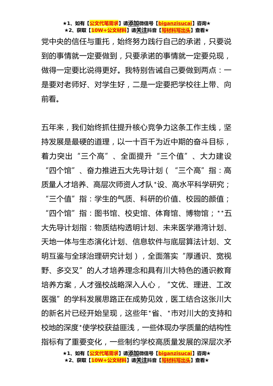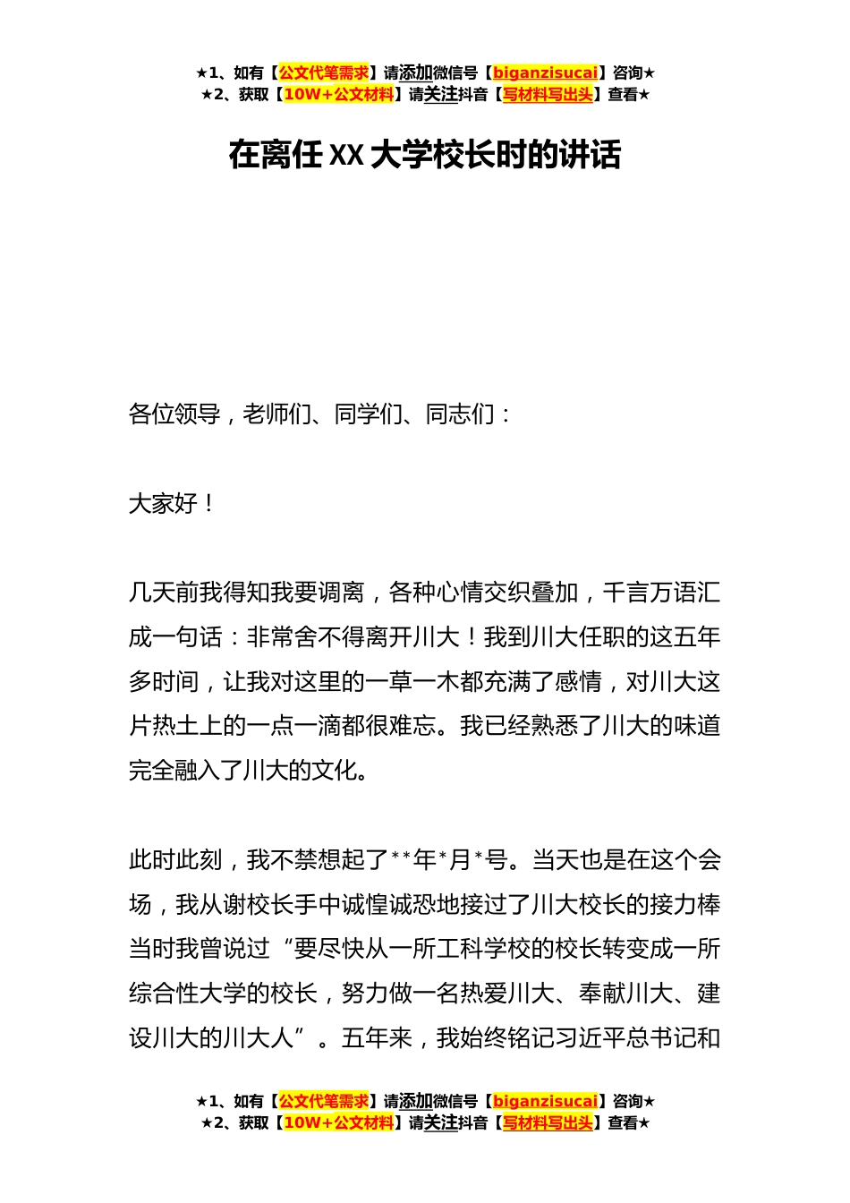 ★1、如有【公文代笔需求】请添加微信号【biganzisucai】咨询★★2、获取【10W+公文材料】请关注抖音【写材料写出头】查看★在离任XX大学校长时的讲话各位领导,老师们、同学们、同志们:大家好!几天前我得知我要调离,各种心情交织叠加,千言万语汇成一句话:非常舍不得离开川大!我到川大任职的这五年多时间,让我对这里的一草一木都充满了感情,对川大这片热土上的一点一滴都很难忘。我已经熟悉了川大的味道完全融入了川大的文化。此时此刻,我不禁想起了**年*月*号。当天也是在这个会场,我从谢校长手中诚惶诚恐地接过了川大校长的接力棒当时我曾说过“要尽快从一所工科学校的校长转变成一所综合性大学的校长,努力做一名热爱川大、奉献川大、建设川大的川大人”。五年来,我始终铭记习近平总书记和★1、如有...