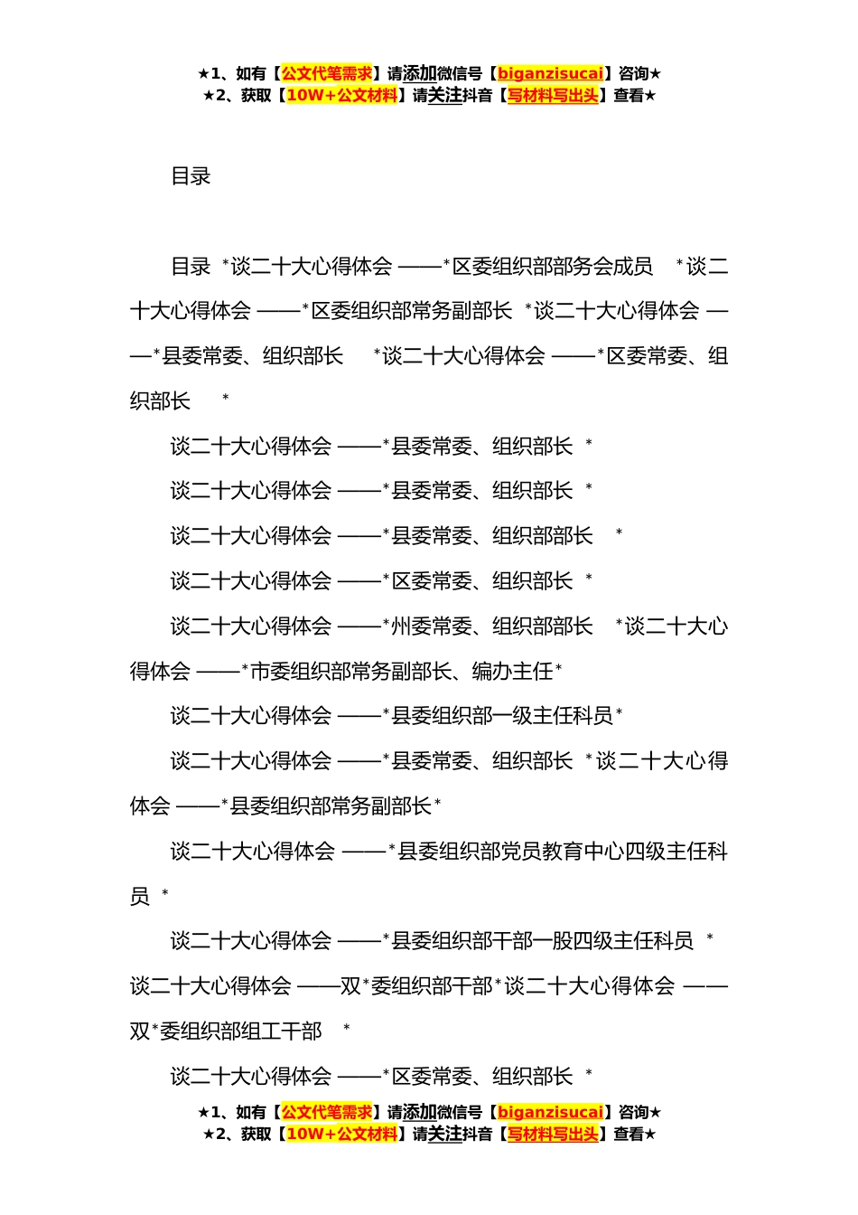 ★1、如有【公文代笔需求】请添加微信号【biganzisucai】咨询★★2、获取【10W+公文材料】请关注抖音【写材料写出头】查看★目录目录*谈二十大心得体会——*区委组织部部务会成员*谈二十大心得体会——*区委组织部常务副部长*谈二十大心得体会——*县委常委、组织部长*谈二十大心得体会——*区委常委、组织部长*谈二十大心得体会——*县委常委、组织部长*谈二十大心得体会——*县委常委、组织部长*谈二十大心得体会——*县委常委、组织部部长*谈二十大心得体会——*区委常委、组织部长*谈二十大心得体会——*州委常委、组织部部长*谈二十大心得体会——*市委组织部常务副部长、编办主任*谈二十大心得体会——*县委组织部一级主任科员*谈二十大心得体会——*县委常委、组织部长*谈二十大心得体会——*县委组织部常...