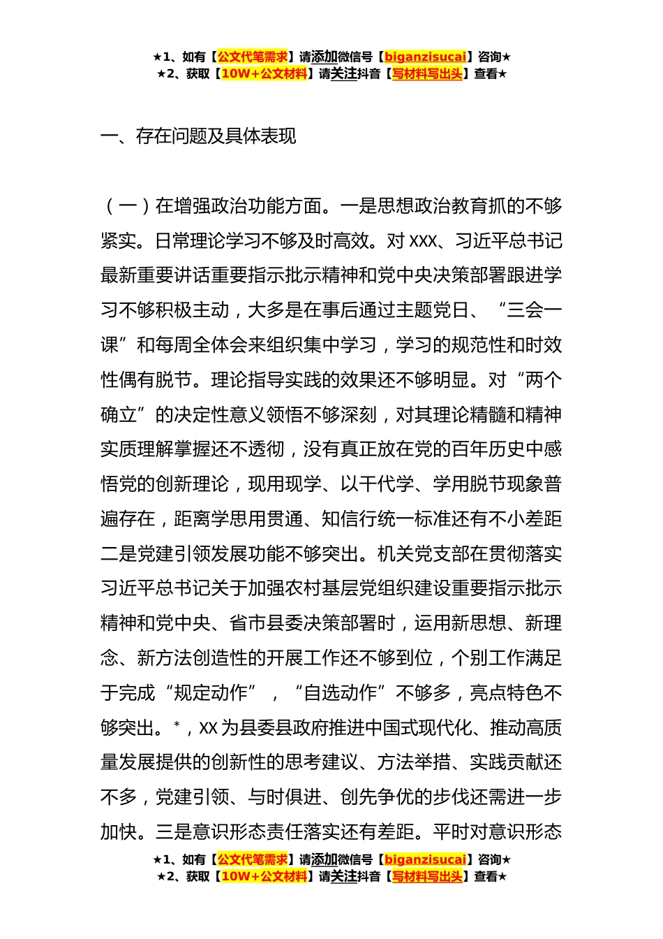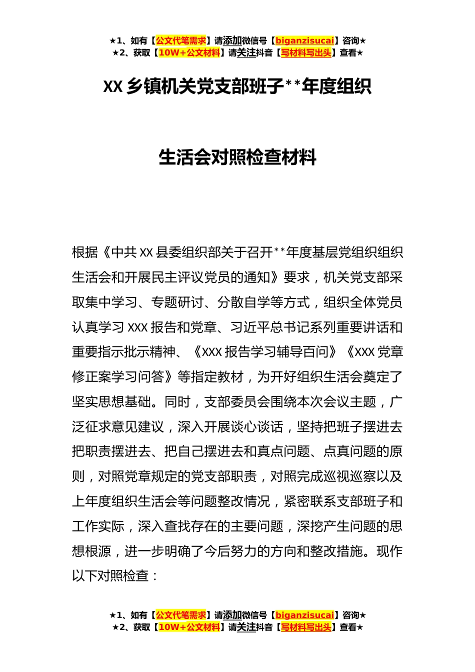 ★1、如有【公文代笔需求】请添加微信号【biganzisucai】咨询★★2、获取【10W+公文材料】请关注抖音【写材料写出头】查看★XX乡镇机关党支部班子**年度组织生活会对照检查材料根据《中共XX县委组织部关于召开**年度基层党组织组织生活会和开展民主评议党员的通知》要求,机关党支部采取集中学习、专题研讨、分散自学等方式,组织全体党员认真学习XXX报告和党章、习近平总书记系列重要讲话和重要指示批示精神、《XXX报告学习辅导百问》《XXX党章修正案学习问答》等指定教材,为开好组织生活会奠定了坚实思想基础。同时,支部委员会围绕本次会议主题,广泛征求意见建议,深入开展谈心谈话,坚持把班子摆进去把职责摆进去、把自己摆进去和真点问题、点真问题的原则,对照党章规定的党支部职责,对照完成巡视巡察以及...