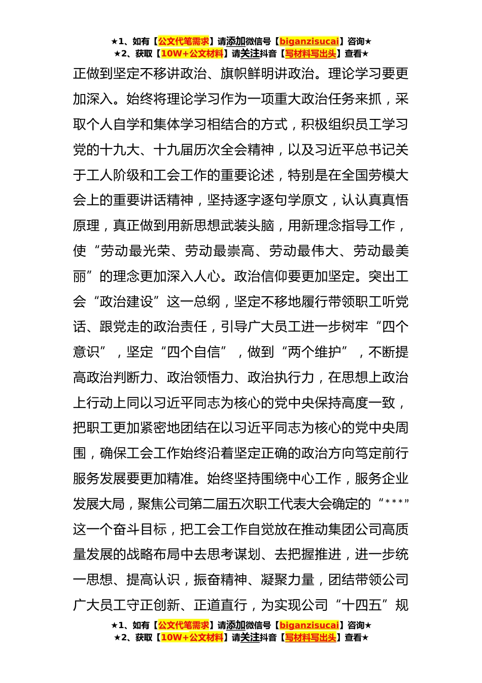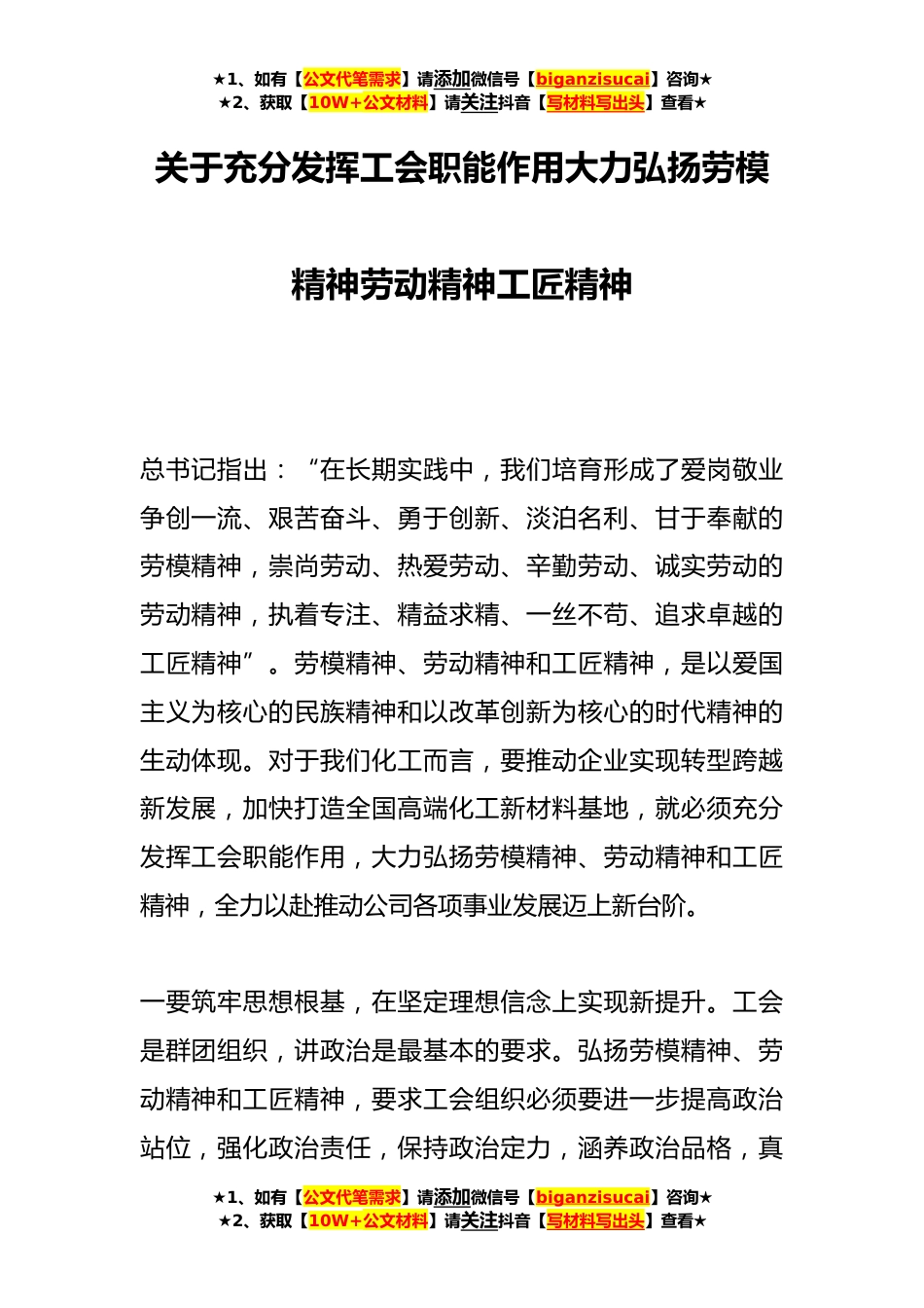 ★1、如有【公文代笔需求】请添加微信号【biganzisucai】咨询★★2、获取【10W+公文材料】请关注抖音【写材料写出头】查看★关于充分发挥工会职能作用大力弘扬劳模精神劳动精神工匠精神总书记指出:“在长期实践中,我们培育形成了爱岗敬业争创一流、艰苦奋斗、勇于创新、淡泊名利、甘于奉献的劳模精神,崇尚劳动、热爱劳动、辛勤劳动、诚实劳动的劳动精神,执着专注、精益求精、一丝不苟、追求卓越的工匠精神”。劳模精神、劳动精神和工匠精神,是以爱国主义为核心的民族精神和以改革创新为核心的时代精神的生动体现。对于我们化工而言,要推动企业实现转型跨越新发展,加快打造全国高端化工新材料基地,就必须充分发挥工会职能作用,大力弘扬劳模精神、劳动精神和工匠精神,全力以赴推动公司各项事业发展迈上新...