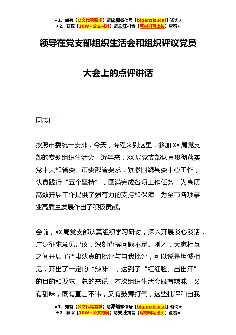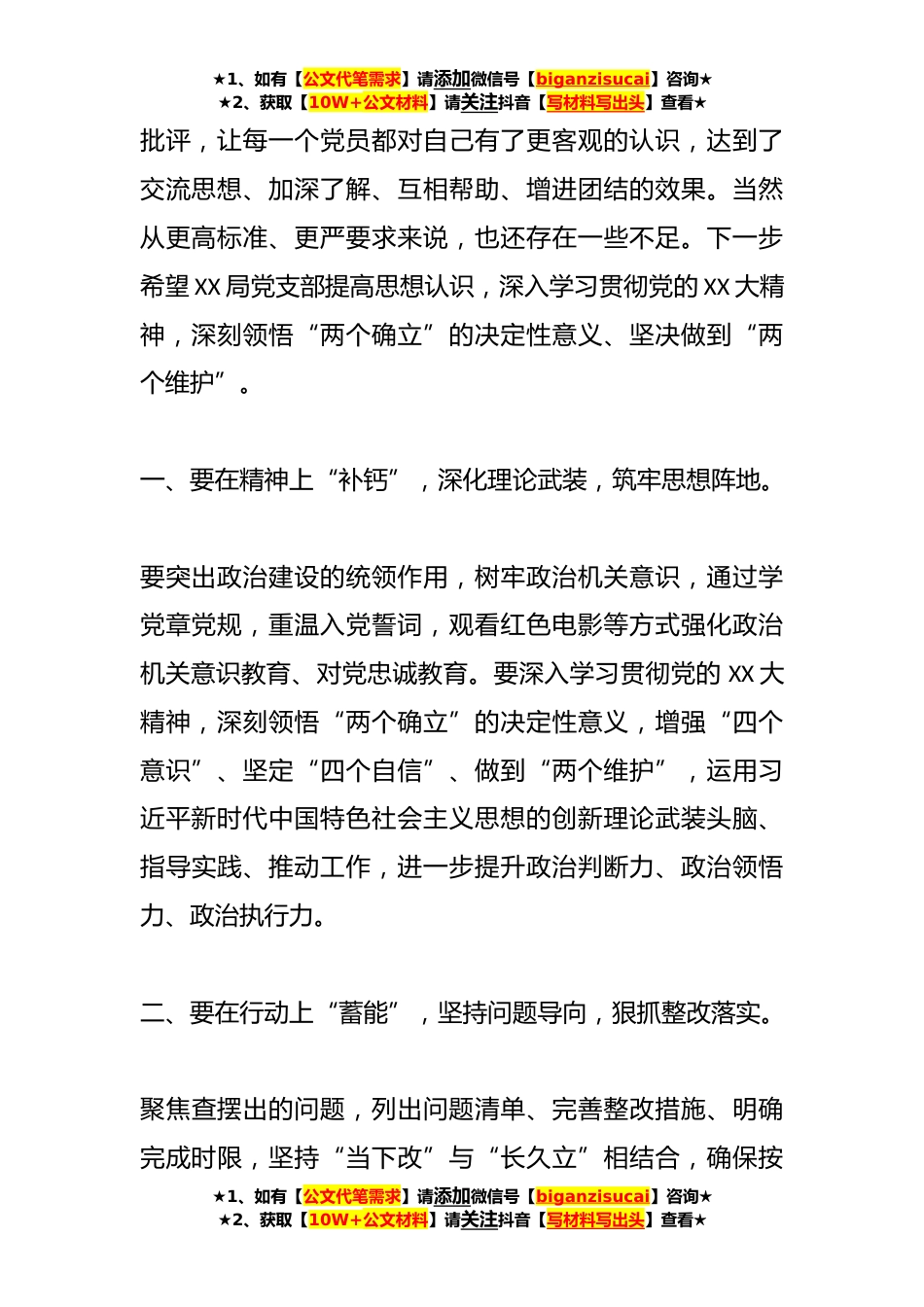 ★1、如有【公文代笔需求】请添加微信号【biganzisucai】咨询★★2、获取【10W+公文材料】请关注抖音【写材料写出头】查看★领导在党支部组织生活会和组织评议党员大会上的点评讲话同志们:按照市委统一安排,今天,专程来到这里,参加XX局党支部的专题组织生活会。近年来,XX局党支部认真贯彻落实党中央和省委、市委部署要求,紧紧围绕县委中心工作,认真践行“五个坚持”,圆满完成各项工作任务,为高质高效开展工作提供了强有力的支持和保障,为全市各项事业高质量发展作出了积极贡献。会前,XX局党支部认真组织学习研讨,深入开展谈心谈话,广泛征求意见建议,深刻查摆问题不足。刚才,大家相互之间开展了严肃认真的批评与自我批评,可以说是坦诚相见,开出了一定的“辣味”,达到了“红红脸、出出汗”的目的...
