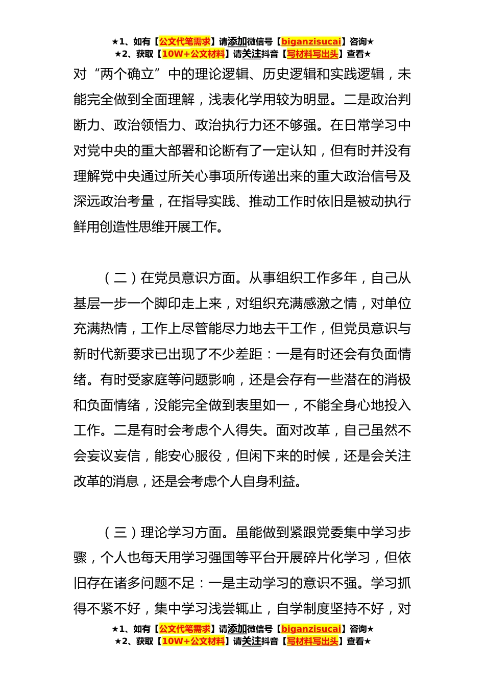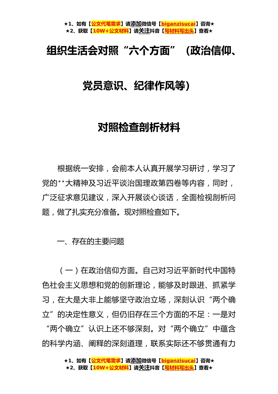 ★1、如有【公文代笔需求】请添加微信号【biganzisucai】咨询★★2、获取【10W+公文材料】请关注抖音【写材料写出头】查看★组织生活会对照“六个方面”(政治信仰、党员意识、纪律作风等)对照检查剖析材料根据统一安排,会前本人认真开展学习研讨,学习了党的**大精神及习近平谈治国理政第四卷等内容,同时,广泛征求意见建议,深入开展谈心谈话,全面检视剖析问题,做了扎实充分准备。现对照检查如下。一、存在的主要问题(一)在政治信仰方面。自己对习近平新时代中国特色社会主义思想和党的创新理论,能够及时跟进、抓紧学习,在大是大非上能够坚守政治立场,深刻认识“两个确立”的决定性意义,但仍旧存在三个方面的不足:一是对“两个确立”认识上还不够深刻。对“两个确立”中蕴含的科学内涵、阐释的深刻...