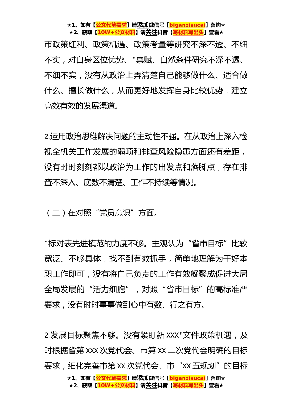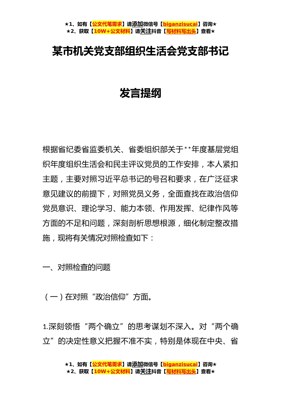 ★1、如有【公文代笔需求】请添加微信号【biganzisucai】咨询★★2、获取【10W+公文材料】请关注抖音【写材料写出头】查看★某市机关党支部组织生活会党支部书记发言提纲根据省纪委省监委机关、省委组织部关于**年度基层党组织年度组织生活会和民主评议党员的工作安排,本人紧扣主题,主要对照习近平总书记的号召和要求,在广泛征求意见建议的前提下,对照党员义务,全面查找在政治信仰党员意识、理论学习、能力本领、作用发挥、纪律作风等方面的不足和问题,深刻剖析思想根源,细化制定整改措施,现将有关情况对照检查如下:一、对照检查的问题(一)在对照“政治信仰”方面。1.深刻领悟“两个确立”的思考谋划不深入。对“两个确立”的决定性意义把握不准不实,特别是体现在中央、省★1、如有【公文代笔需求】请...