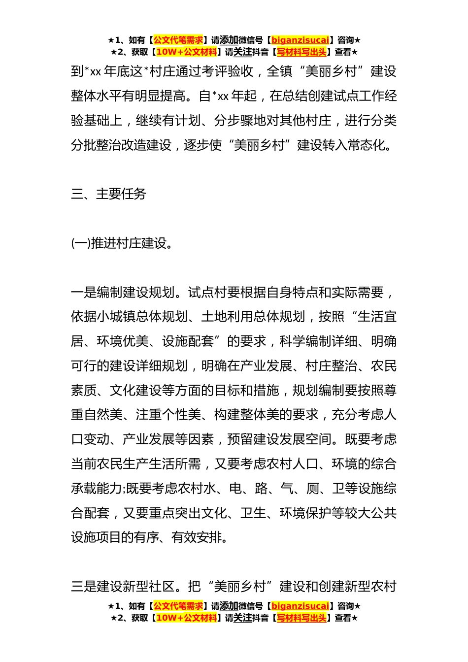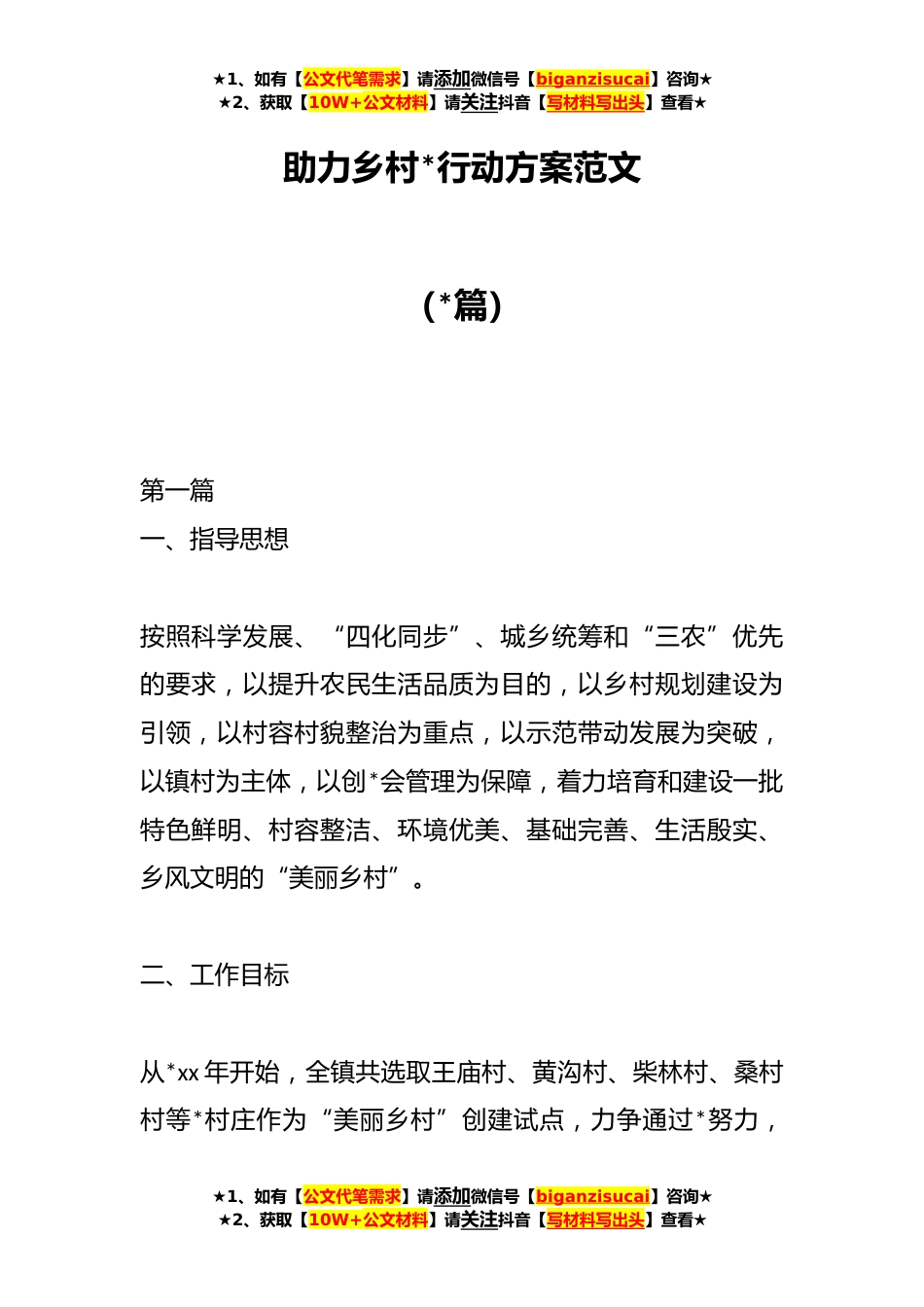 ★1、如有【公文代笔需求】请添加微信号【biganzisucai】咨询★★2、获取【10W+公文材料】请关注抖音【写材料写出头】查看★助力乡村*行动方案范文(*篇)第一篇一、指导思想按照科学发展、“四化同步”、城乡统筹和“三农”优先的要求,以提升农民生活品质为目的,以乡村规划建设为引领,以村容村貌整治为重点,以示范带动发展为突破,以镇村为主体,以创*会管理为保障,着力培育和建设一批特色鲜明、村容整洁、环境优美、基础完善、生活殷实、乡风文明的“美丽乡村”。二、工作目标从*xx年开始,全镇共选取王庙村、黄沟村、柴林村、桑村村等*村庄作为“美丽乡村”创建试点,力争通过*努力,★1、如有【公文代笔需求】请添加微信号【biganzisucai】咨询★★2、获取【10W+公文材料】请关注抖音【写材料写出头】查...