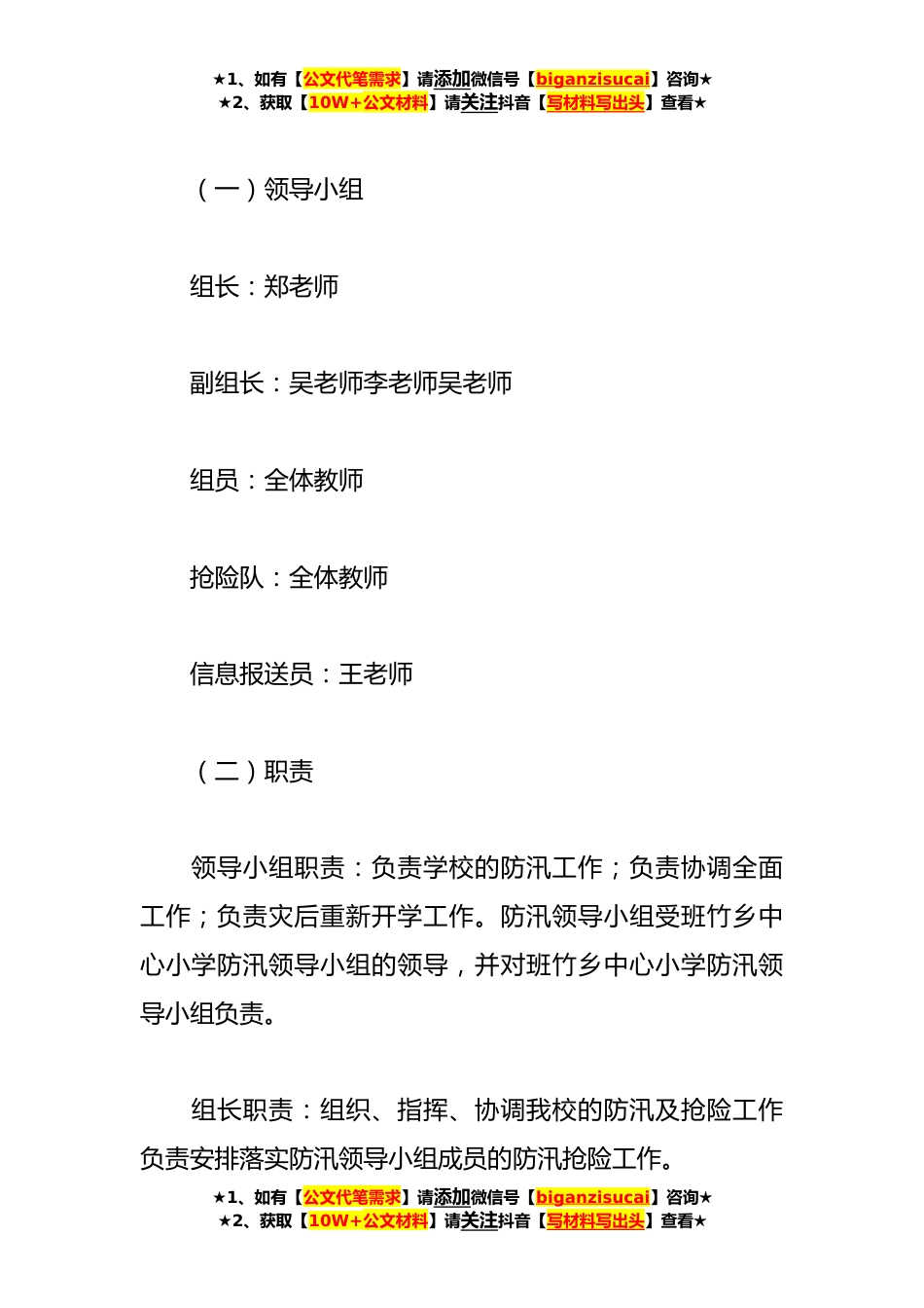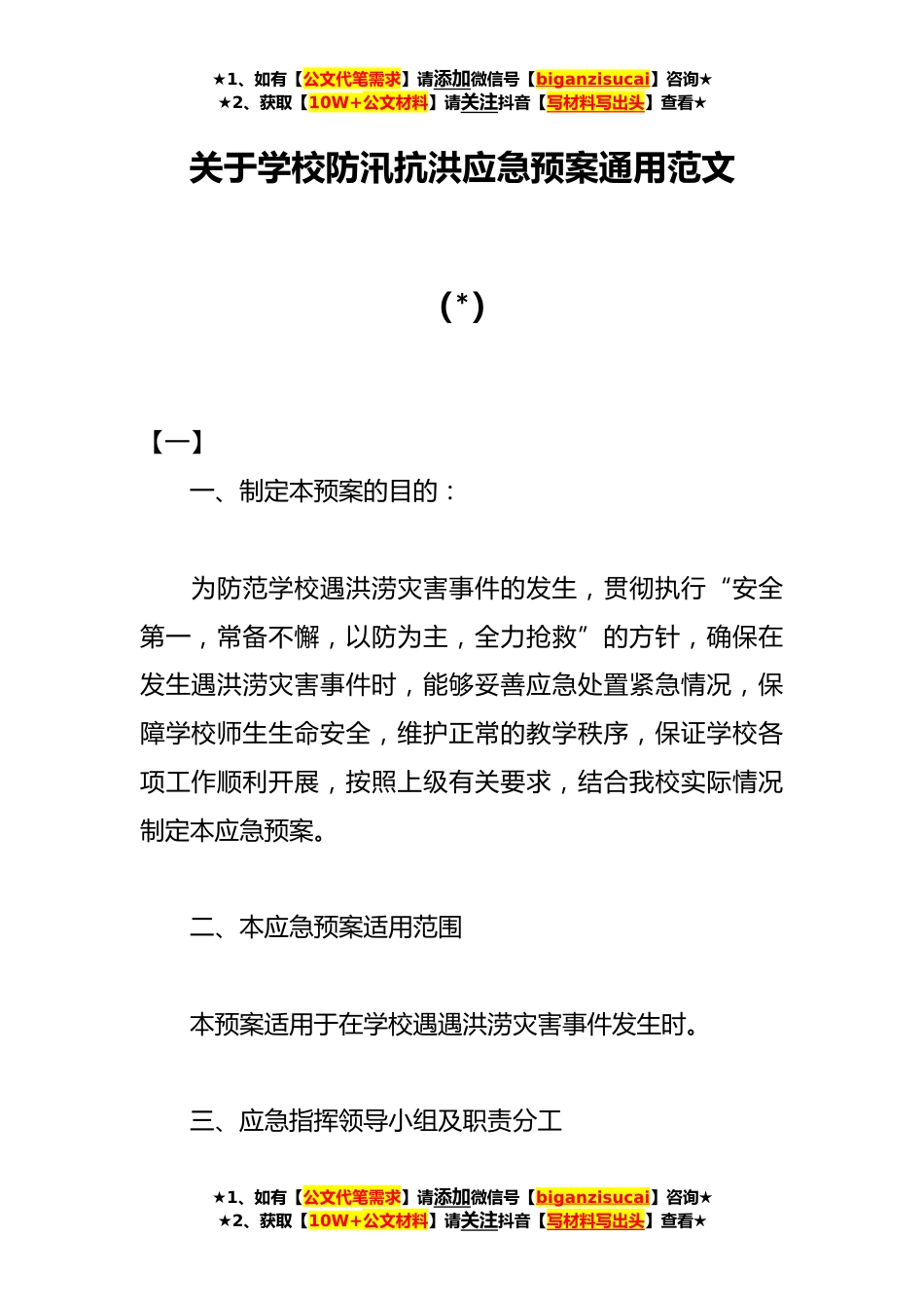 ★1、如有【公文代笔需求】请添加微信号【biganzisucai】咨询★★2、获取【10W+公文材料】请关注抖音【写材料写出头】查看★关于学校防汛抗洪应急预案通用范文(*)【一】一、制定本预案的目的:为防范学校遇洪涝灾害事件的发生,贯彻执行“安全第一,常备不懈,以防为主,全力抢救”的方针,确保在发生遇洪涝灾害事件时,能够妥善应急处置紧急情况,保障学校师生生命安全,维护正常的教学秩序,保证学校各项工作顺利开展,按照上级有关要求,结合我校实际情况制定本应急预案。二、本应急预案适用范围本预案适用于在学校遇遇洪涝灾害事件发生时。三、应急指挥领导小组及职责分工★1、如有【公文代笔需求】请添加微信号【biganzisucai】咨询★★2、获取【10W+公文材料】请关注抖音【写材料写出头】查看★★1、如有...