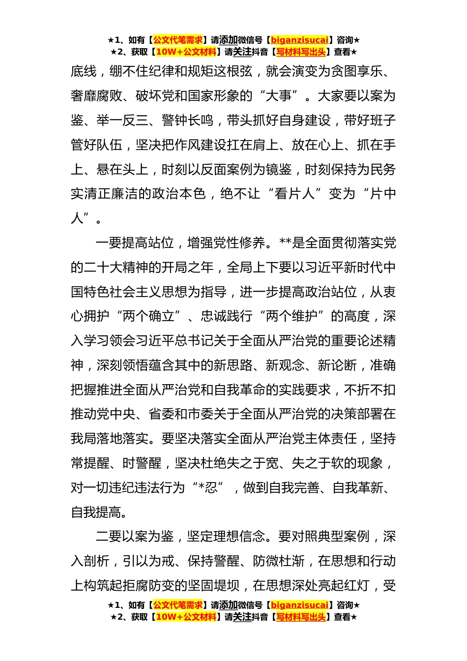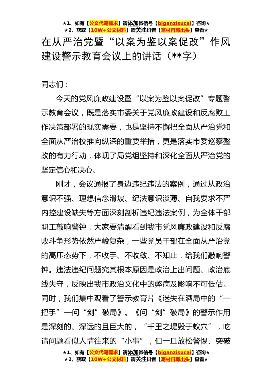 ★1、如有【公文代笔需求】请添加微信号【biganzisucai】咨询★★2、获取【10W+公文材料】请关注抖音【写材料写出头】查看★在从严治党暨“以案为鉴以案促改”作风建设警示教育会议上的讲话(**字)同志们:今天的党风廉政建设暨“以案为鉴以案促改”专题警示教育会议,既是落实市委关于党风廉政建设和反腐败工作决策部署的现实需要,也是坚持不懈把全面从严治党和全面从严治校推向纵深的重要举措,更是落实市委巡察整改的有力行动,体现了局党组坚持和深化全面从严治党的坚定信心和决心。刚才,会议通报了身边违纪违法的案例,通过从政治意识不强、理想信念滑坡、纪法意识淡薄、自我要求不严内控建设缺失等方面深刻剖析违纪违法案例,为全体干部职工敲响警钟,大家要清醒看到我市党风廉政建设和反腐败斗争形势依...