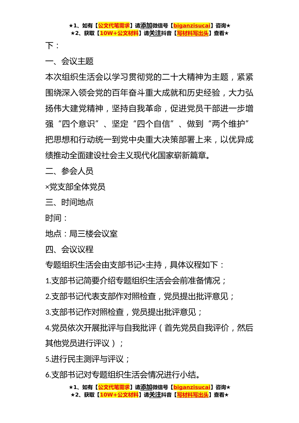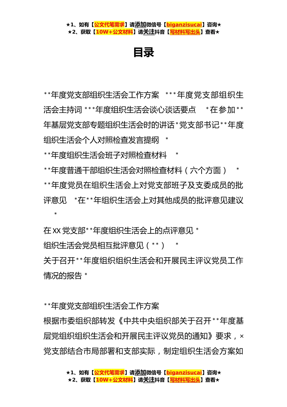 ★1、如有【公文代笔需求】请添加微信号【biganzisucai】咨询★★2、获取【10W+公文材料】请关注抖音【写材料写出头】查看★目录**年度党支部组织生活会工作方案***年度党支部组织生活会主持词***年度组织生活会谈心谈话要点*在参加**年基层党支部专题组织生活会时的讲话*党支部书记**年度组织生活会个人对照检查发言提纲***年度组织生活会班子对照检查材料***年度普通干部组织生活会对照检查材料(六个方面)***年度党员在组织生活会上对党支部班子及支委成员的批评意见*在**年组织生活会上对其他成员的批评意见建议*在XX党支部**年度组织生活会上的点评意见*组织生活会党员相互批评意见(**)*关于召开**年度组织组织生活会和开展民主评议党员工作情况的报告***年度党支部组织生活会工作方案根据市委组织部转发...