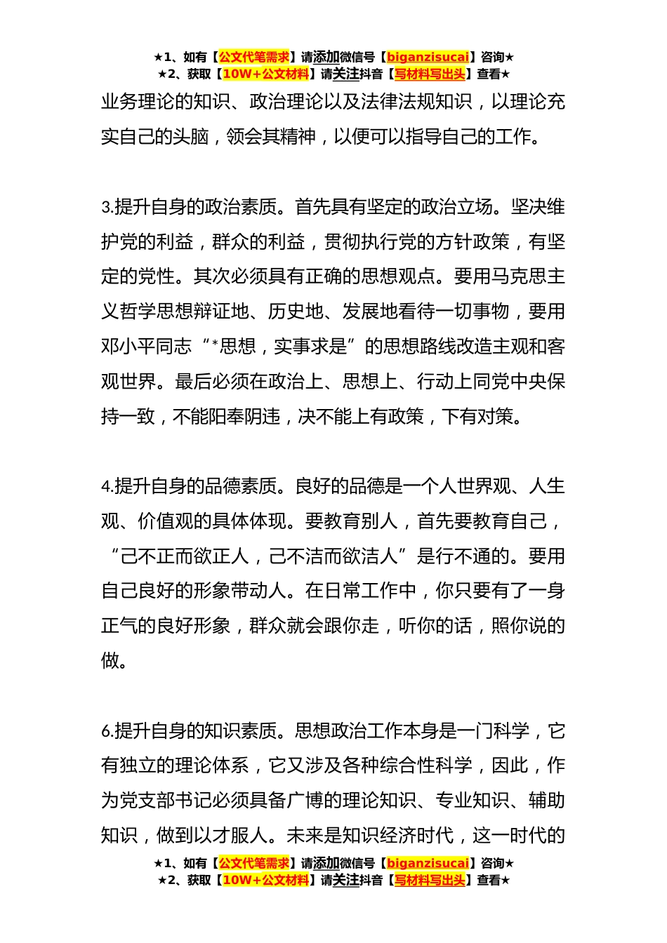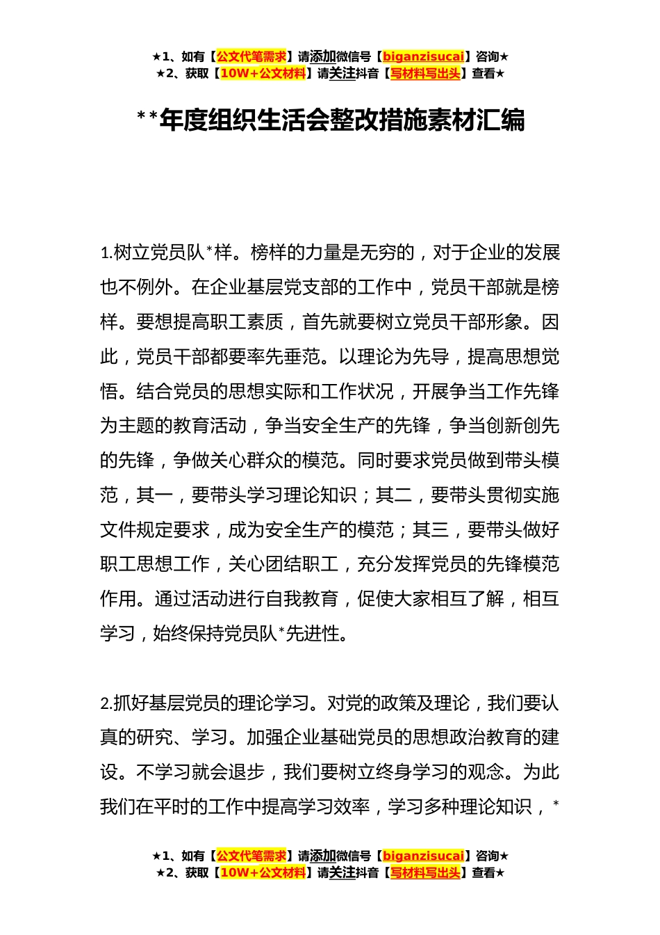 ★1、如有【公文代笔需求】请添加微信号【biganzisucai】咨询★★2、获取【10W+公文材料】请关注抖音【写材料写出头】查看★**年度组织生活会整改措施素材汇编1.树立党员队*样。榜样的力量是无穷的,对于企业的发展也不例外。在企业基层党支部的工作中,党员干部就是榜样。要想提高职工素质,首先就要树立党员干部形象。因此,党员干部都要率先垂范。以理论为先导,提高思想觉悟。结合党员的思想实际和工作状况,开展争当工作先锋为主题的教育活动,争当安全生产的先锋,争当创新创先的先锋,争做关心群众的模范。同时要求党员做到带头模范,其一,要带头学习理论知识;其二,要带头贯彻实施文件规定要求,成为安全生产的模范;其三,要带头做好职工思想工作,关心团结职工,充分发挥党员的先锋模范作用。通过活动...