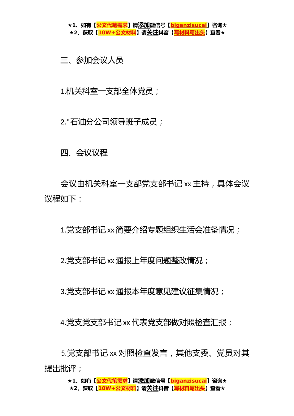 ★1、如有【公文代笔需求】请添加微信号【biganzisucai】咨询★★2、获取【10W+公文材料】请关注抖音【写材料写出头】查看★关于召开组织生活会请示报告批复(*)篇(*分公司党委:机关科室一支部拟定于*xx年x月x日召开专题组织生活会。现将有关情况请示如下:一、会议主题认真学习贯彻习近平新时代中国特色社会主义思想,加强政治建设,提高政治能力,紧密结合xx实际,贯彻新发展理念,推动高质量发展,担当作为,实干争先,努力打造世界领先洁净能源化工公司,为全面建设社会主义现代化国家贡献石化力量。二、时间、地点安排1.会议时间:*xx年x月x日上午**-*:*,会期半天;2.会议地点:分公司四楼大会议室★1、如有【公文代笔需求】请添加微信号【biganzisucai】咨询★★2、获取【10W+公文材料】请关注抖音【写...