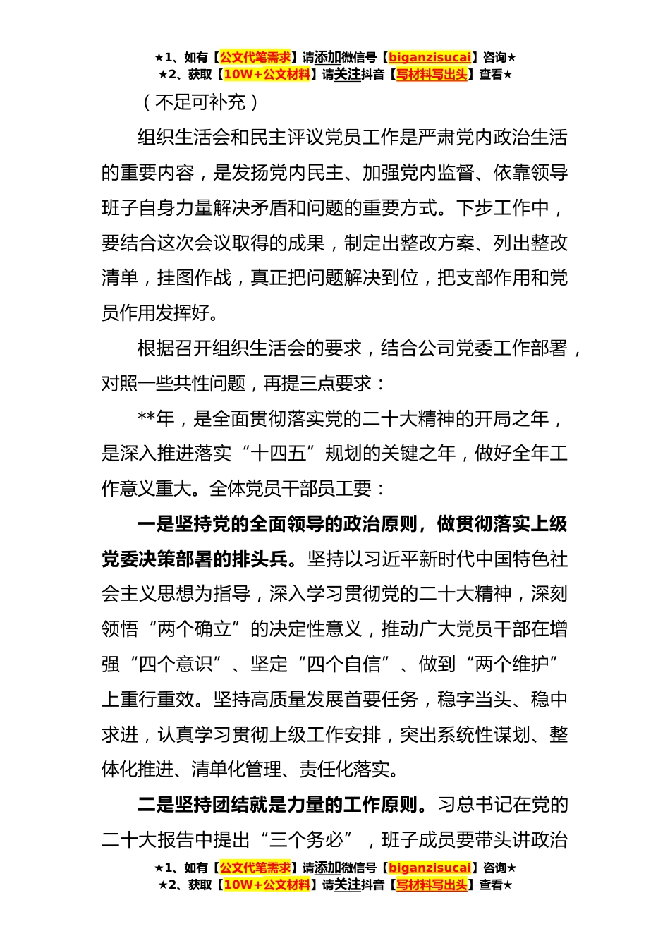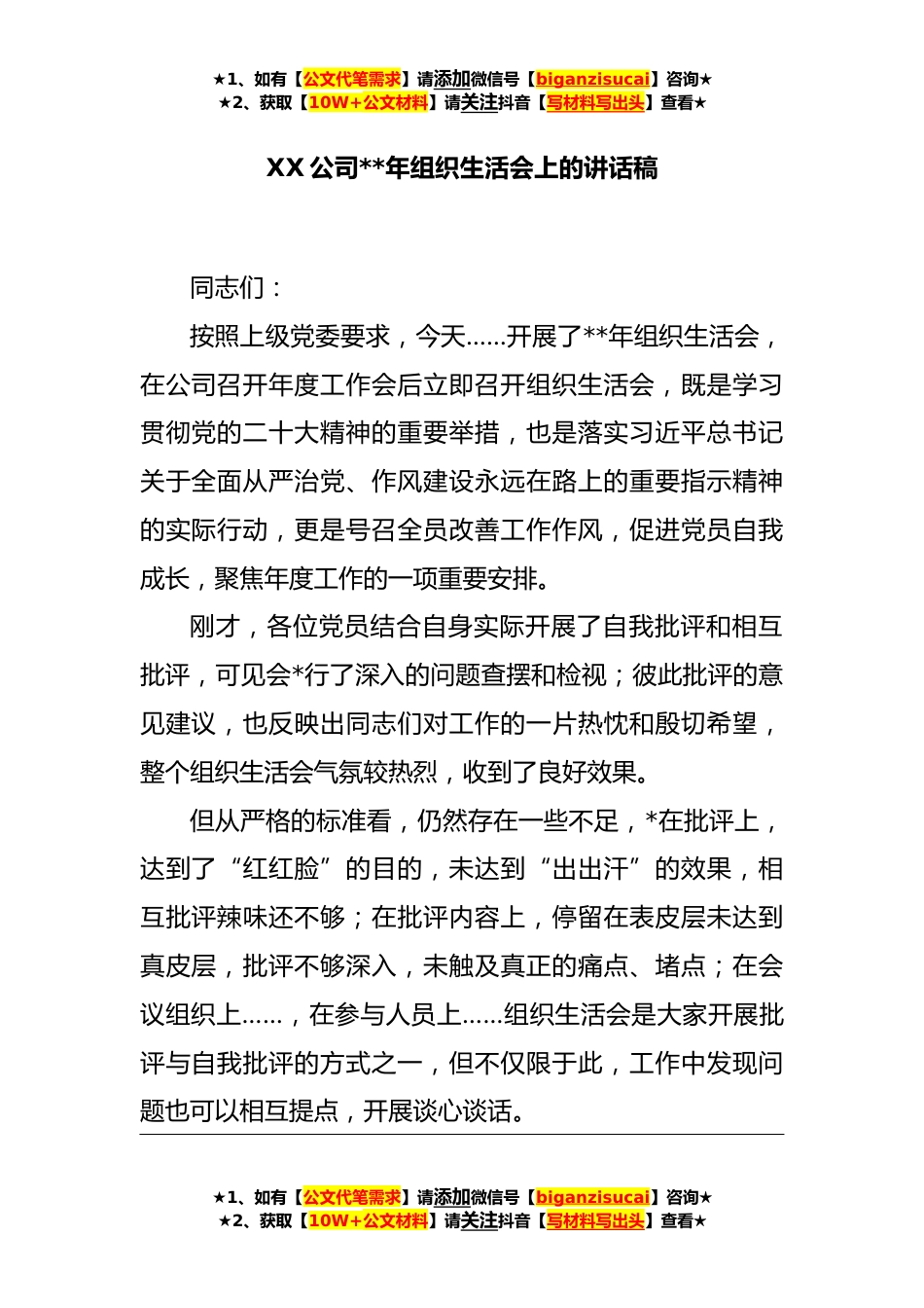 ★1、如有【公文代笔需求】请添加微信号【biganzisucai】咨询★★2、获取【10W+公文材料】请关注抖音【写材料写出头】查看★XX公司**年组织生活会上的讲话稿同志们:按照上级党委要求,今天……开展了**年组织生活会,在公司召开年度工作会后立即召开组织生活会,既是学习贯彻党的二十大精神的重要举措,也是落实习近平总书记关于全面从严治党、作风建设永远在路上的重要指示精神的实际行动,更是号召全员改善工作作风,促进党员自我成长,聚焦年度工作的一项重要安排。刚才,各位党员结合自身实际开展了自我批评和相互批评,可见会*行了深入的问题查摆和检视;彼此批评的意见建议,也反映出同志们对工作的一片热忱和殷切希望,整个组织生活会气氛较热烈,收到了良好效果。但从严格的标准看,仍然存在一些不足,*...