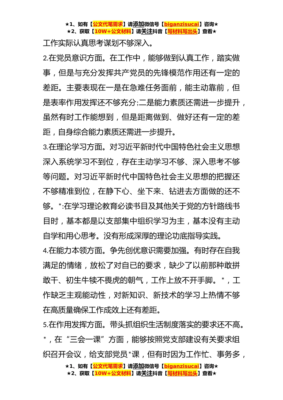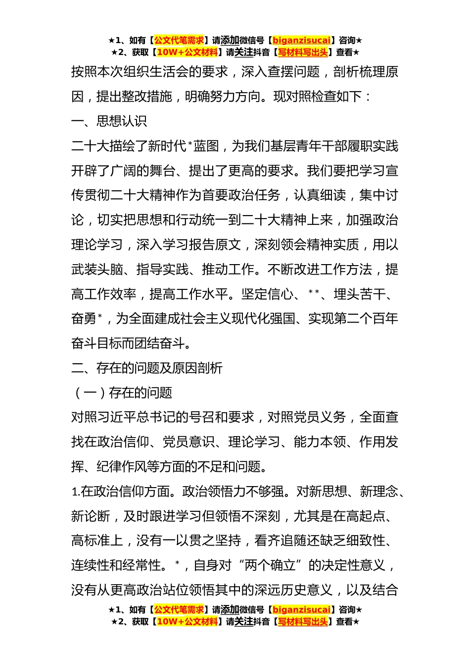 ★1、如有【公文代笔需求】请添加微信号【biganzisucai】咨询★★2、获取【10W+公文材料】请关注抖音【写材料写出头】查看★按照本次组织生活会的要求,深入查摆问题,剖析梳理原因,提出整改措施,明确努力方向。现对照检查如下:一、思想认识二十大描绘了新时代*蓝图,为我们基层青年干部履职实践开辟了广阔的舞台、提出了更高的要求。我们要把学习宣传贯彻二十大精神作为首要政治任务,认真细读,集中讨论,切实把思想和行动统一到二十大精神上来,加强政治理论学习,深入学习报告原文,深刻领会精神实质,用以武装头脑、指导实践、推动工作。不断改进工作方法,提高工作效率,提高工作水平。坚定信心、**、埋头苦干、奋勇*,为全面建成社会主义现代化强国、实现第二个百年奋斗目标而团结奋斗。二、存在的问题...