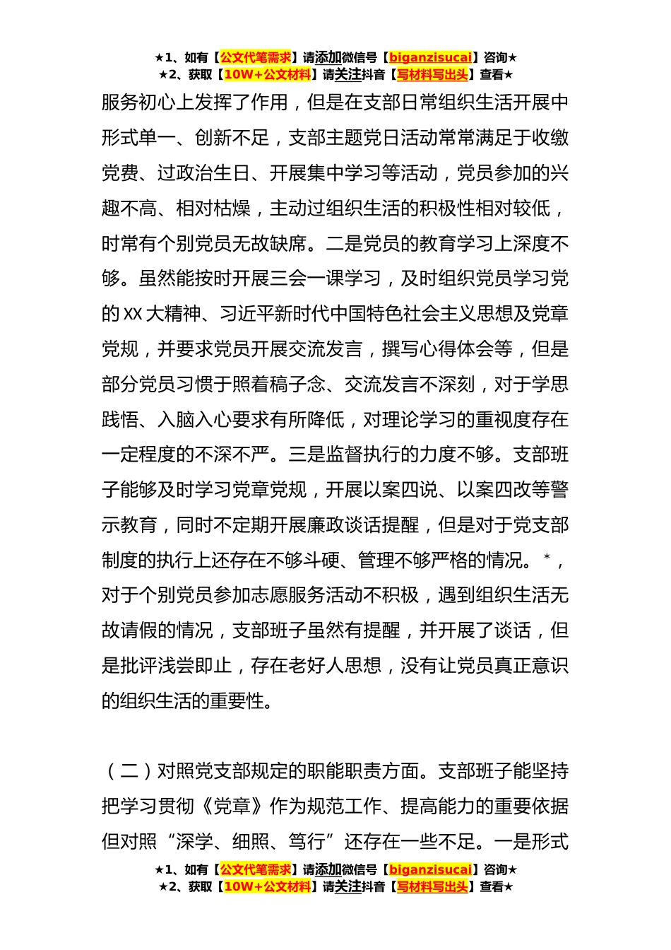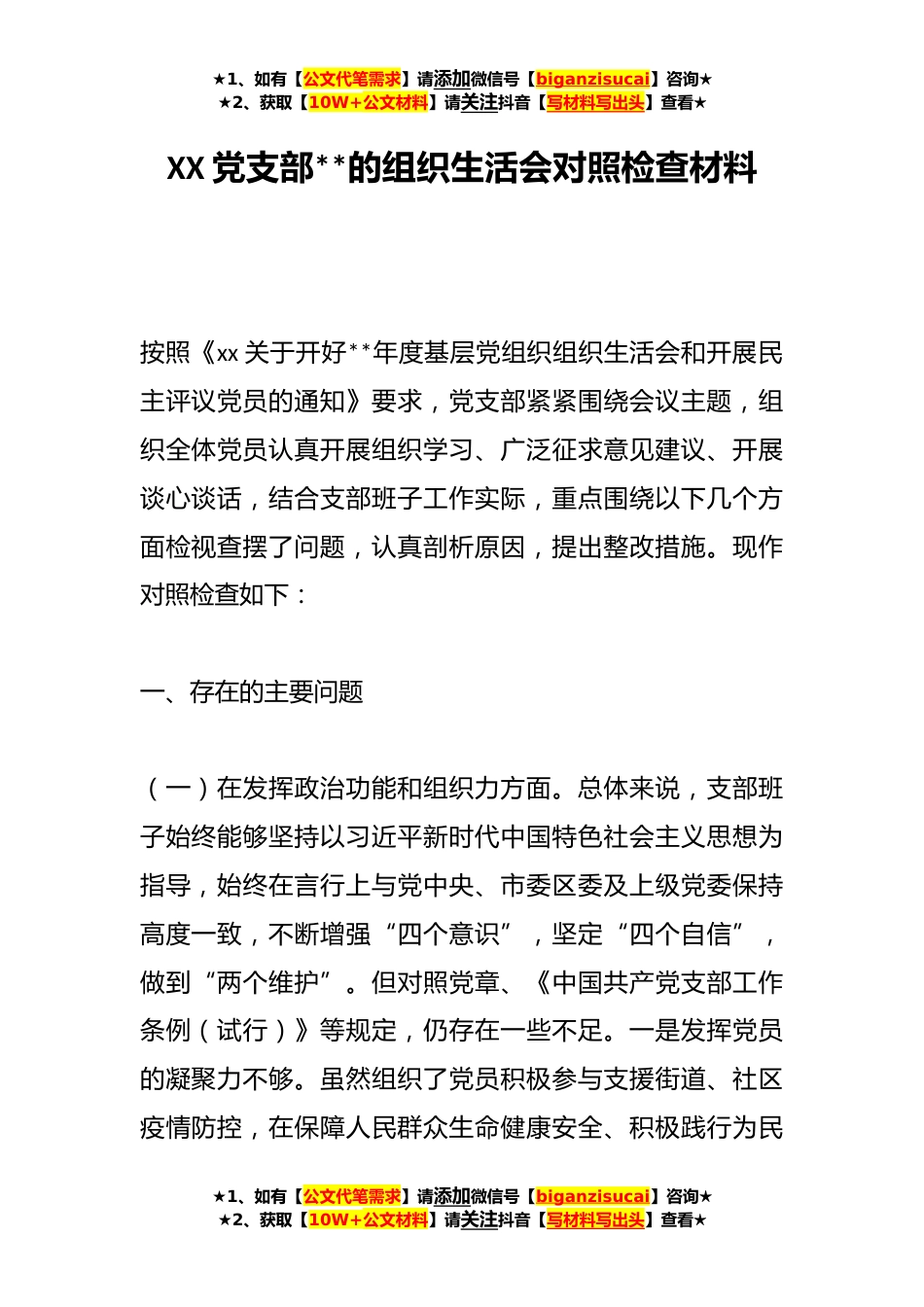★1、如有【公文代笔需求】请添加微信号【biganzisucai】咨询★★2、获取【10W+公文材料】请关注抖音【写材料写出头】查看★XX党支部**的组织生活会对照检查材料按照《xx关于开好**年度基层党组织组织生活会和开展民主评议党员的通知》要求,党支部紧紧围绕会议主题,组织全体党员认真开展组织学习、广泛征求意见建议、开展谈心谈话,结合支部班子工作实际,重点围绕以下几个方面检视查摆了问题,认真剖析原因,提出整改措施。现作对照检查如下:一、存在的主要问题(一)在发挥政治功能和组织力方面。总体来说,支部班子始终能够坚持以习近平新时代中国特色社会主义思想为指导,始终在言行上与党中央、市委区委及上级党委保持高度一致,不断增强“四个意识”,坚定“四个自信”,做到“两个维护”。但对照党章、...