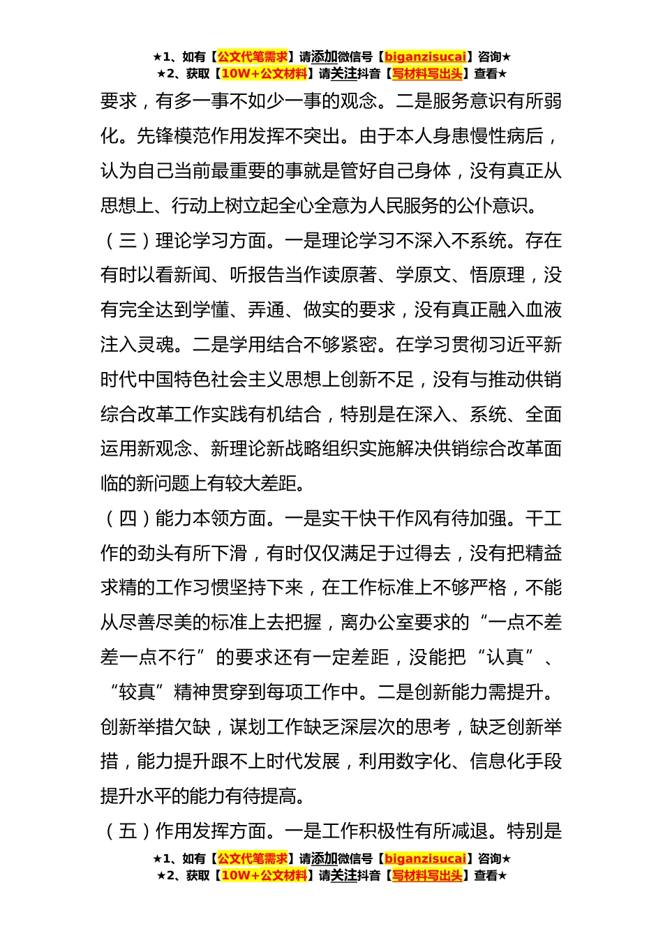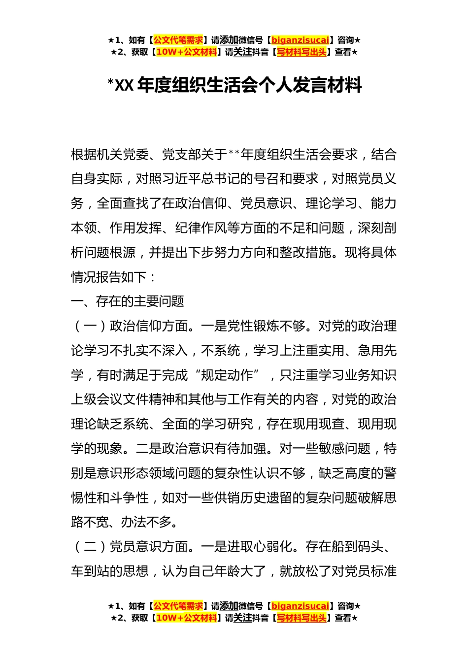 ★1、如有【公文代笔需求】请添加微信号【biganzisucai】咨询★★2、获取【10W+公文材料】请关注抖音【写材料写出头】查看★*XX年度组织生活会个人发言材料根据机关党委、党支部关于**年度组织生活会要求,结合自身实际,对照习近平总书记的号召和要求,对照党员义务,全面查找了在政治信仰、党员意识、理论学习、能力本领、作用发挥、纪律作风等方面的不足和问题,深刻剖析问题根源,并提出下步努力方向和整改措施。现将具体情况报告如下:一、存在的主要问题(一)政治信仰方面。一是党性锻炼不够。对党的政治理论学习不扎实不深入,不系统,学习上注重实用、急用先学,有时满足于完成“规定动作”,只注重学习业务知识上级会议文件精神和其他与工作有关的内容,对党的政治理论缺乏系统、全面的学习研究,存在现...