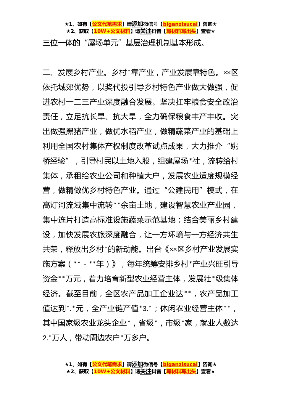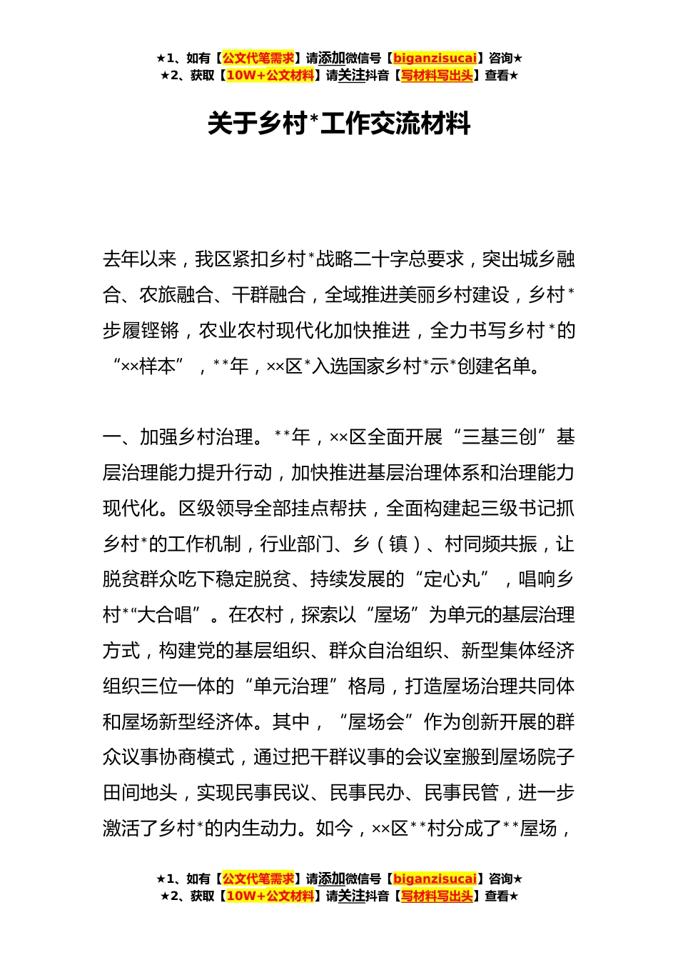 ★1、如有【公文代笔需求】请添加微信号【biganzisucai】咨询★★2、获取【10W+公文材料】请关注抖音【写材料写出头】查看★关于乡村*工作交流材料去年以来,我区紧扣乡村*战略二十字总要求,突出城乡融合、农旅融合、干群融合,全域推进美丽乡村建设,乡村*步履铿锵,农业农村现代化加快推进,全力书写乡村*的“××样本”,**年,××区*入选国家乡村*示*创建名单。一、加强乡村治理。**年,××区全面开展“三基三创”基层治理能力提升行动,加快推进基层治理体系和治理能力现代化。区级领导全部挂点帮扶,全面构建起三级书记抓乡村*的工作机制,行业部门、乡(镇)、村同频共振,让脱贫群众吃下稳定脱贫、持续发展的“定心丸”,唱响乡村*“大合唱”。在农村,探索以“屋场”为单元的基层治理方式,构建党的基...