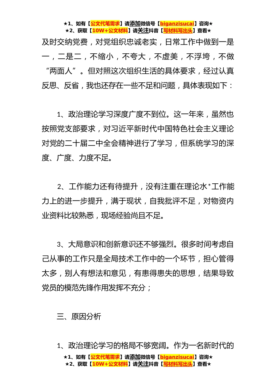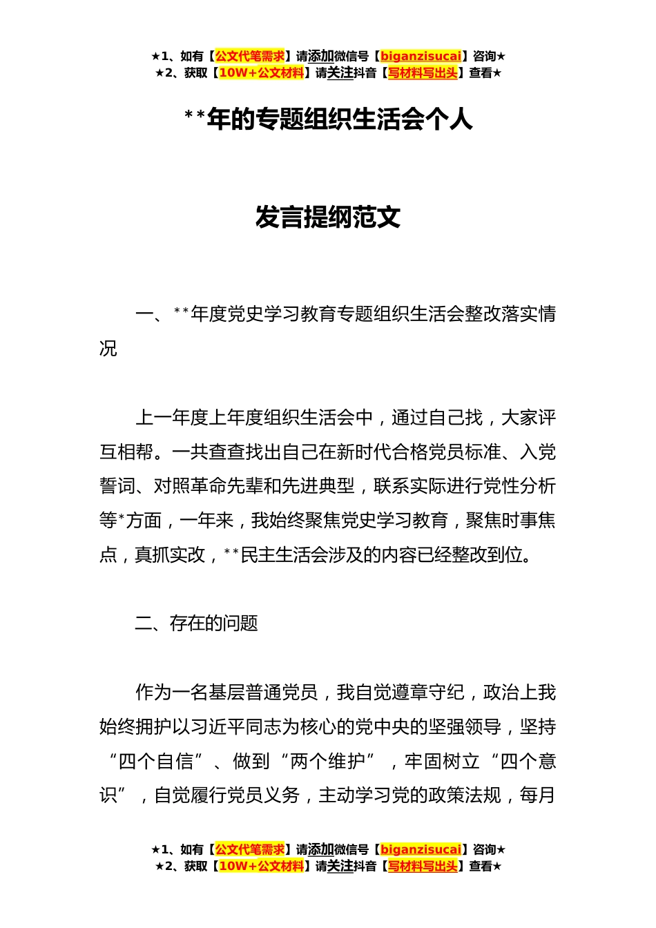 ★1、如有【公文代笔需求】请添加微信号【biganzisucai】咨询★★2、获取【10W+公文材料】请关注抖音【写材料写出头】查看★**年的专题组织生活会个人发言提纲范文一、**年度党史学习教育专题组织生活会整改落实情况上一年度上年度组织生活会中,通过自己找,大家评互相帮。一共查查找出自己在新时代合格党员标准、入党誓词、对照革命先辈和先进典型,联系实际进行党性分析等*方面,一年来,我始终聚焦党史学习教育,聚焦时事焦点,真抓实改,**民主生活会涉及的内容已经整改到位。二、存在的问题作为一名基层普通党员,我自觉遵章守纪,政治上我始终拥护以习近平同志为核心的党中央的坚强领导,坚持“四个自信”、做到“两个维护”,牢固树立“四个意识”,自觉履行党员义务,主动学习党的政策法规,每月★1、如...