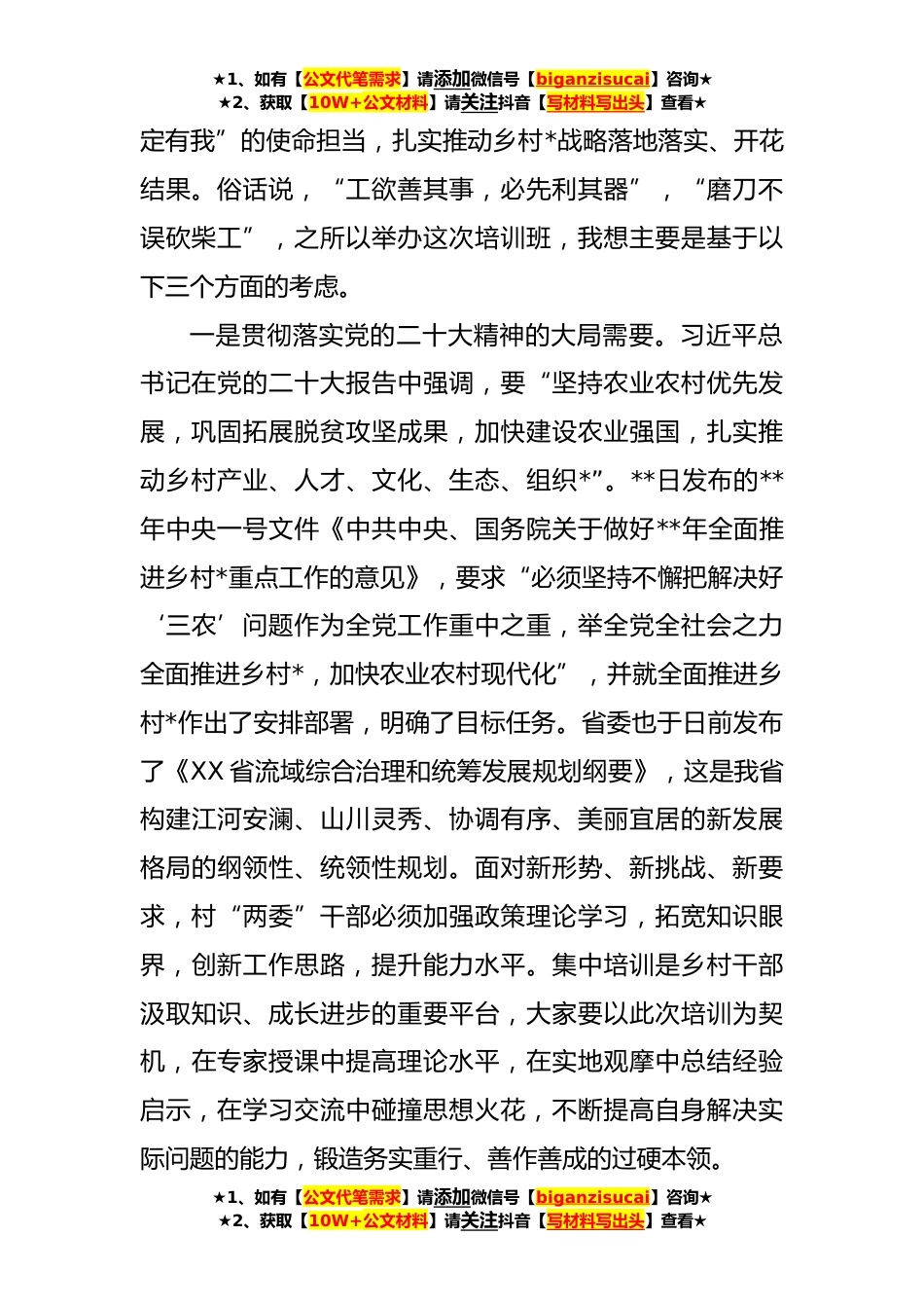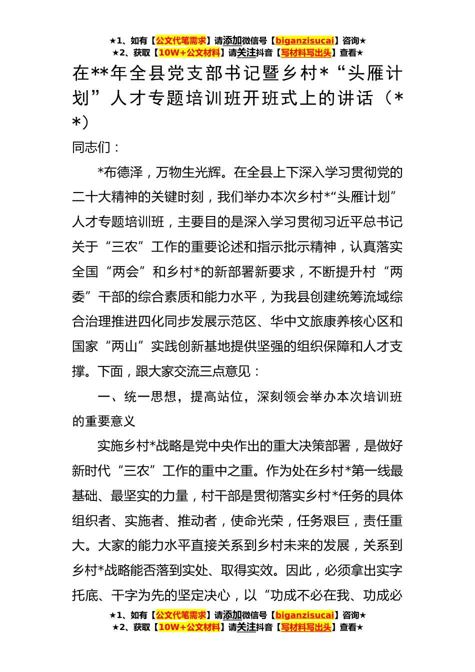 ★1、如有【公文代笔需求】请添加微信号【biganzisucai】咨询★★2、获取【10W+公文材料】请关注抖音【写材料写出头】查看★在**年全县党支部书记暨乡村*“头雁计划”人才专题培训班开班式上的讲话(**)同志们:*布德泽,万物生光辉。在全县上下深入学习贯彻党的二十大精神的关键时刻,我们举办本次乡村*“头雁计划”人才专题培训班,主要目的是深入学习贯彻习近平总书记关于“三农”工作的重要论述和指示批示精神,认真落实全国“两会”和乡村*的新部署新要求,不断提升村“两委”干部的综合素质和能力水平,为我县创建统筹流域综合治理推进四化同步发展示范区、华中文旅康养核心区和国家“两山”实践创新基地提供坚强的组织保障和人才支撑。下面,跟大家交流三点意见:一、统一思想,提高站位,深刻领会举办本...