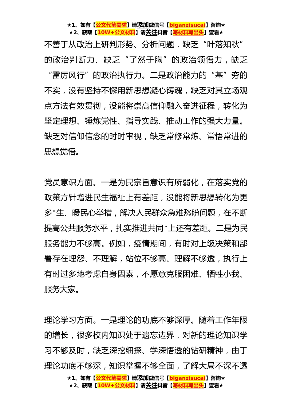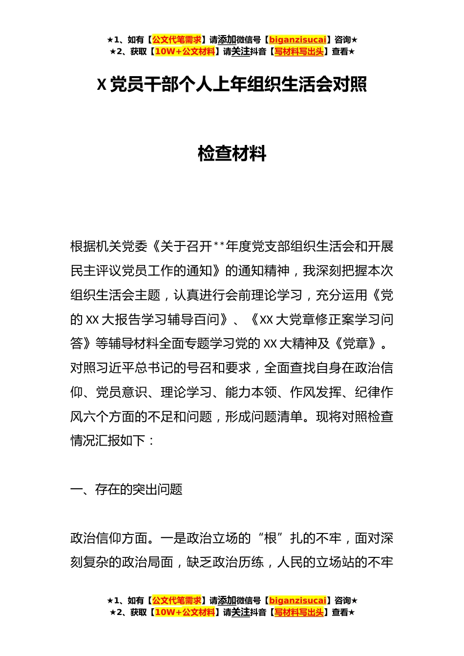★1、如有【公文代笔需求】请添加微信号【biganzisucai】咨询★★2、获取【10W+公文材料】请关注抖音【写材料写出头】查看★X党员干部个人上年组织生活会对照检查材料根据机关党委《关于召开**年度党支部组织生活会和开展民主评议党员工作的通知》的通知精神,我深刻把握本次组织生活会主题,认真进行会前理论学习,充分运用《党的XX大报告学习辅导百问》、《XX大党章修正案学习问答》等辅导材料全面专题学习党的XX大精神及《党章》。对照习近平总书记的号召和要求,全面查找自身在政治信仰、党员意识、理论学习、能力本领、作风发挥、纪律作风六个方面的不足和问题,形成问题清单。现将对照检查情况汇报如下:一、存在的突出问题政治信仰方面。一是政治立场的“根”扎的不牢,面对深刻复杂的政治局面,缺乏政治历...