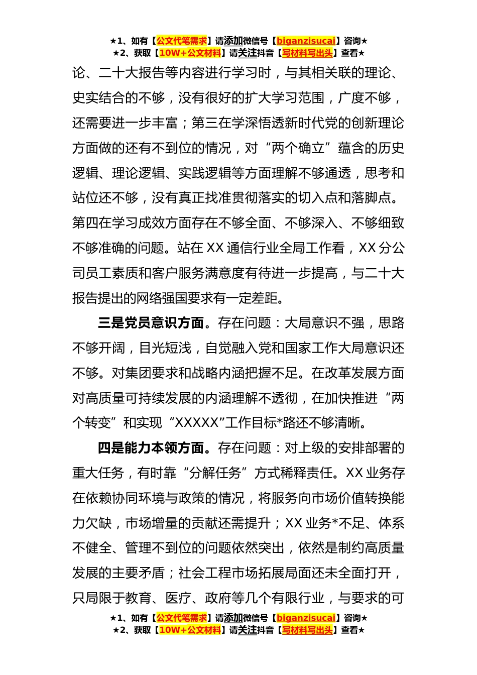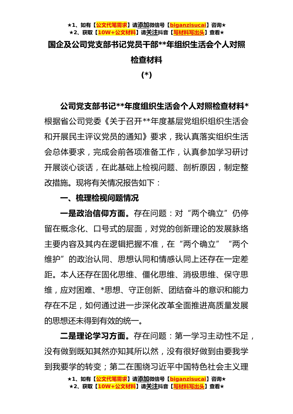 ★1、如有【公文代笔需求】请添加微信号【biganzisucai】咨询★★2、获取【10W+公文材料】请关注抖音【写材料写出头】查看★国企及公司党支部书记党员干部**年组织生活会个人对照检查材料(*)公司党支部书记**年度组织生活会个人对照检查材料*根据省公司党委《关于召开**年度基层党组织组织生活会和开展民主评议党员的通知》要求,我认真落实组织生活会总体要求,完成会前各项准备工作,认真参加学习研讨开展谈心谈话,在此基础上检视问题、剖析原因,制定整改措施。现将有关情况报告如下:一、梳理检视问题情况一是政治信仰方面。存在问题:对“两个确立”仍停留在概念化、口号式的层面,对党的创新理论的发展脉络主要内容及其内在逻辑把握不准,在“两个确立”“两个维护”的政治认同、思想认同和情感认同上还存...
