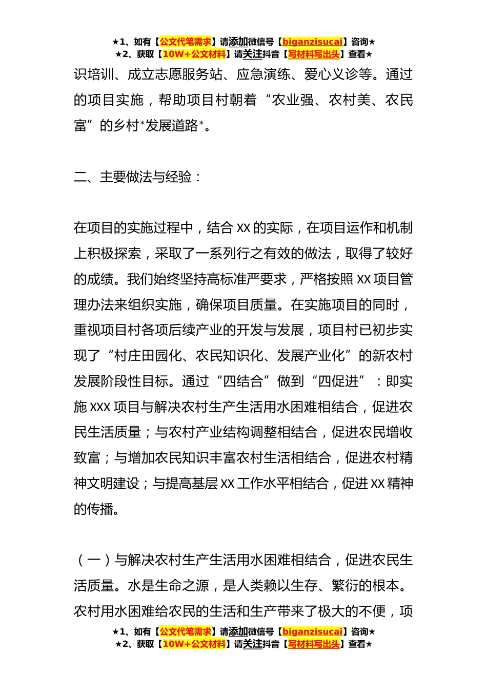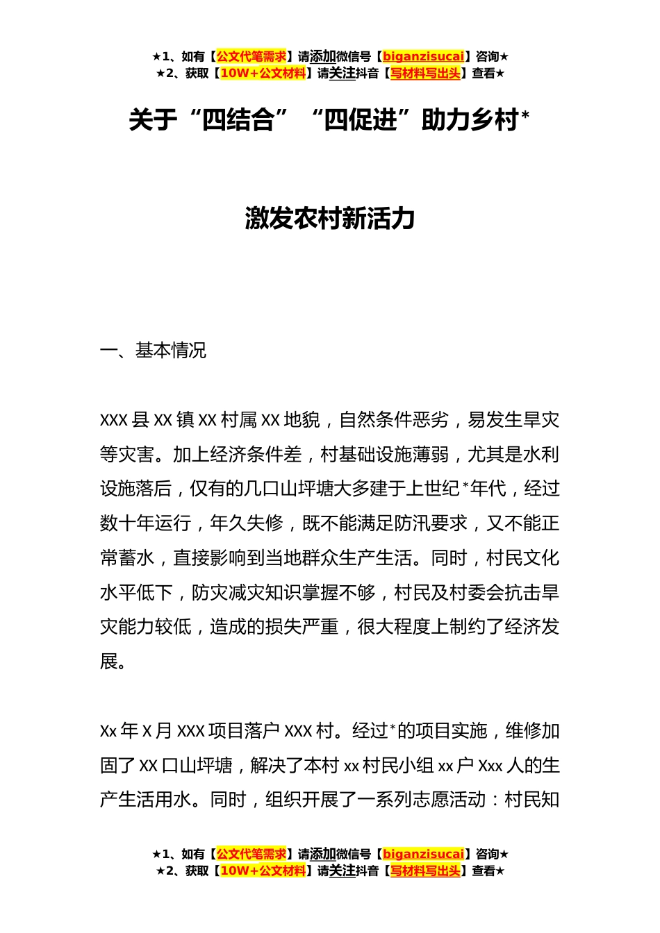 ★1、如有【公文代笔需求】请添加微信号【biganzisucai】咨询★★2、获取【10W+公文材料】请关注抖音【写材料写出头】查看★关于“四结合”“四促进”助力乡村*激发农村新活力一、基本情况XXX县XX镇XX村属XX地貌,自然条件恶劣,易发生旱灾等灾害。加上经济条件差,村基础设施薄弱,尤其是水利设施落后,仅有的几口山坪塘大多建于上世纪*年代,经过数十年运行,年久失修,既不能满足防汛要求,又不能正常蓄水,直接影响到当地群众生产生活。同时,村民文化水平低下,防灾减灾知识掌握不够,村民及村委会抗击旱灾能力较低,造成的损失严重,很大程度上制约了经济发展。Xx年X月XXX项目落户XXX村。经过*的项目实施,维修加固了XX口山坪塘,解决了本村xx村民小组xx户Xxx人的生产生活用水。同时,组织开展了一系列志愿...