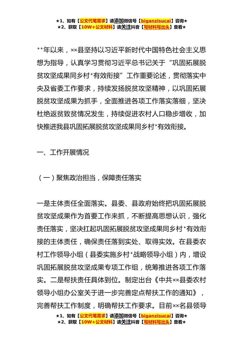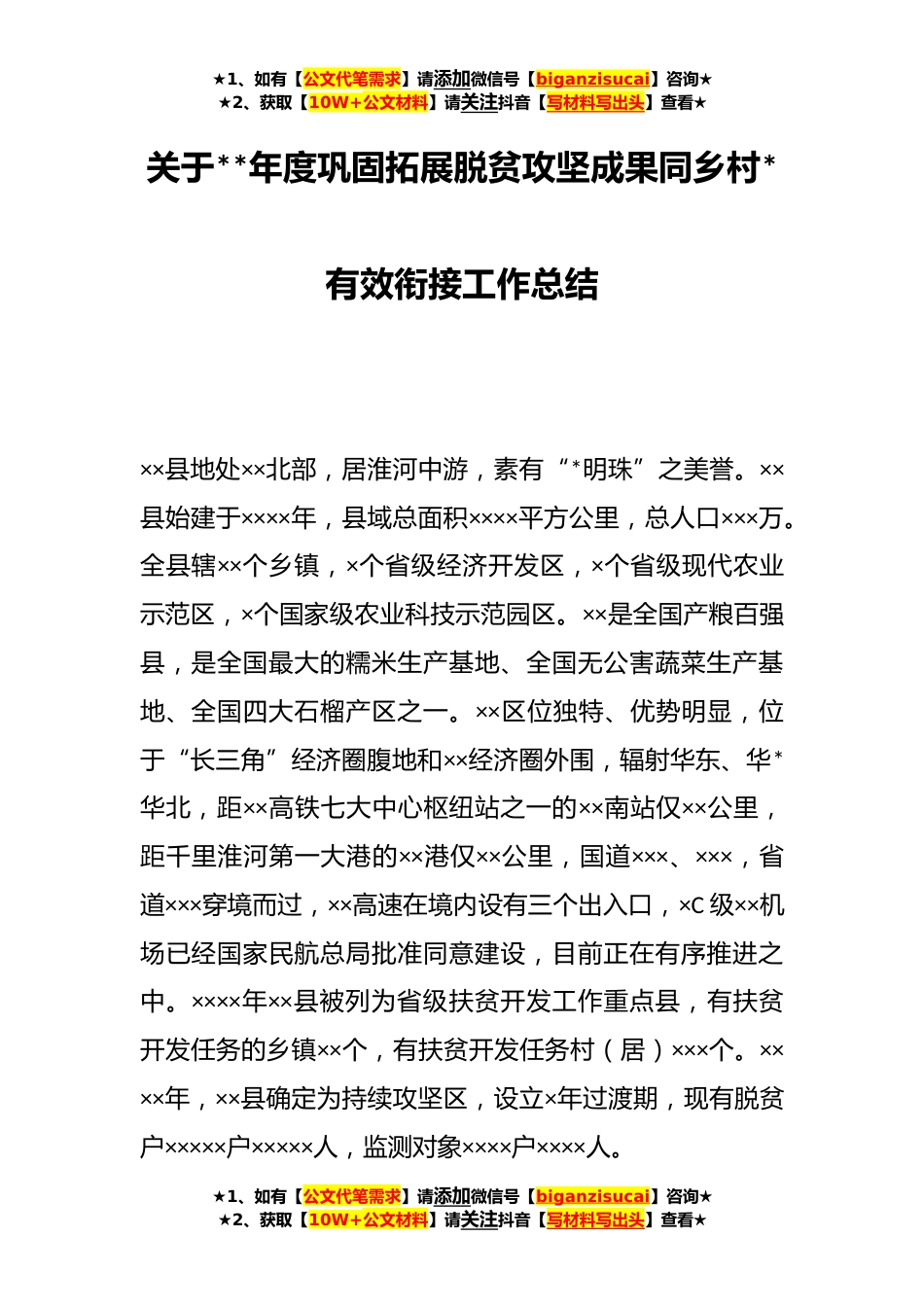 ★1、如有【公文代笔需求】请添加微信号【biganzisucai】咨询★★2、获取【10W+公文材料】请关注抖音【写材料写出头】查看★关于**年度巩固拓展脱贫攻坚成果同乡村*有效衔接工作总结××县地处××北部,居淮河中游,素有“*明珠”之美誉。××县始建于××××年,县域总面积××××平方公里,总人口×××万。全县辖××个乡镇,×个省级经济开发区,×个省级现代农业示范区,×个国家级农业科技示范园区。××是全国产粮百强县,是全国最大的糯米生产基地、全国无公害蔬菜生产基地、全国四大石榴产区之一。××区位独特、优势明显,位于“长三角”经济圈腹地和××经济圈外围,辐射华东、华*华北,距××高铁七大中心枢纽站之一的××南站仅××公里,距千里淮河第一大港的××港仅××公里,国道×××、××...