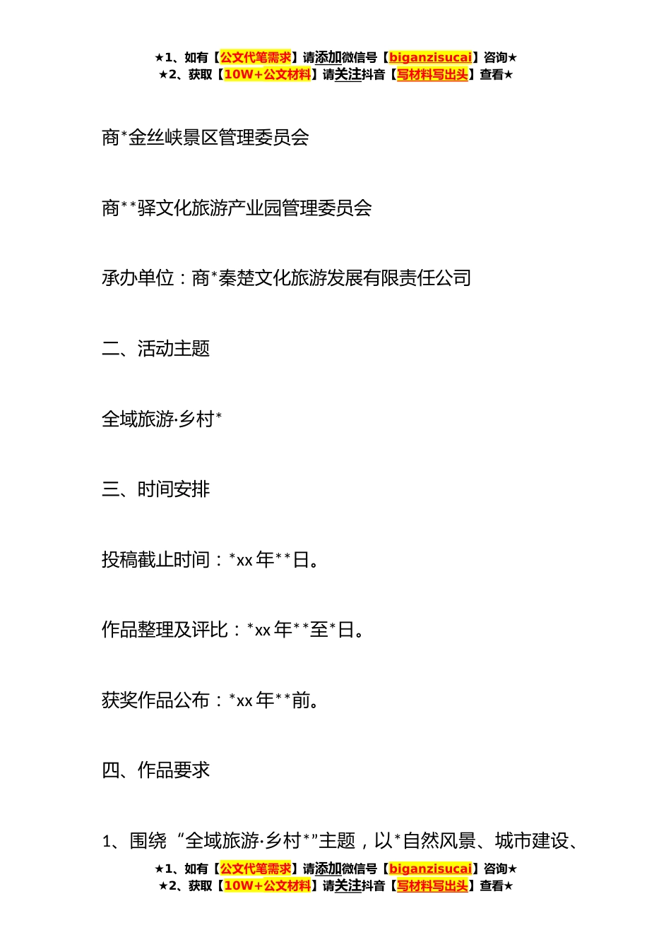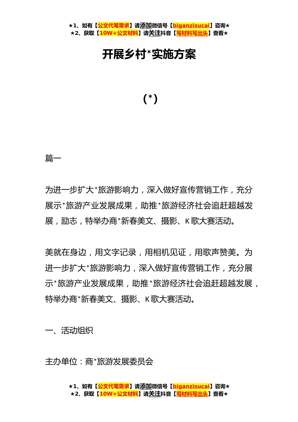 ★1、如有【公文代笔需求】请添加微信号【biganzisucai】咨询★★2、获取【10W+公文材料】请关注抖音【写材料写出头】查看★开展乡村*实施方案(*)篇一为进一步扩大*旅游影响力,深入做好宣传营销工作,充分展示*旅游产业发展成果,助推*旅游经济社会追赶超越发展,励志,特举办商*新春美文、摄影、K歌大赛活动。美就在身边,用文字记录,用相机见证,用歌声赞美。为进一步扩大*旅游影响力,深入做好宣传营销工作,充分展示*旅游产业发展成果,助推*旅游经济社会追赶超越发展,特举办商*新春美文、摄影、K歌大赛活动。一、活动组织主办单位:商*旅游发展委员会★1、如有【公文代笔需求】请添加微信号【biganzisucai】咨询★★2、获取【10W+公文材料】请关注抖音【写材料写出头】查看★★1、如有【公文代笔需求】...