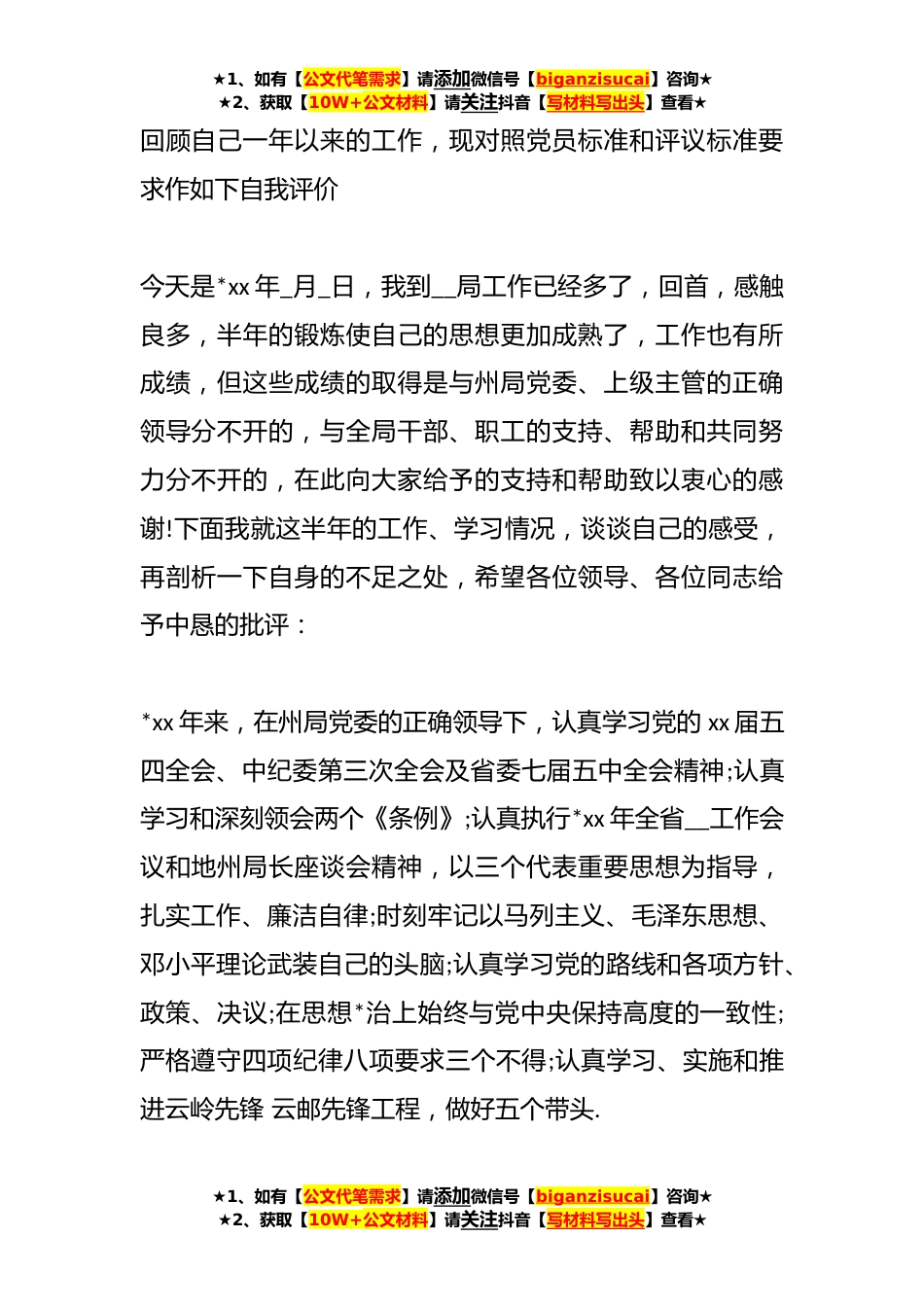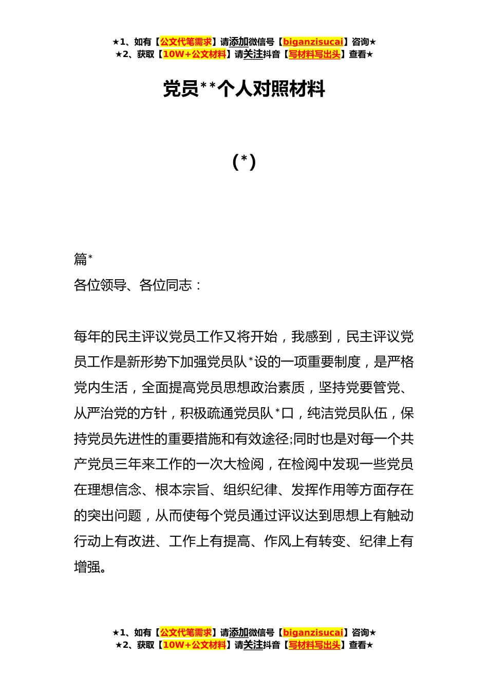 ★1、如有【公文代笔需求】请添加微信号【biganzisucai】咨询★★2、获取【10W+公文材料】请关注抖音【写材料写出头】查看★党员**个人对照材料(*)篇*各位领导、各位同志:每年的民主评议党员工作又将开始,我感到,民主评议党员工作是新形势下加强党员队*设的一项重要制度,是严格党内生活,全面提高党员思想政治素质,坚持党要管党、从严治党的方针,积极疏通党员队*口,纯洁党员队伍,保持党员先进性的重要措施和有效途径;同时也是对每一个共产党员三年来工作的一次大检阅,在检阅中发现一些党员在理想信念、根本宗旨、组织纪律、发挥作用等方面存在的突出问题,从而使每个党员通过评议达到思想上有触动行动上有改进、工作上有提高、作风上有转变、纪律上有增强。★1、如有【公文代笔需求】请添加微信号【big...