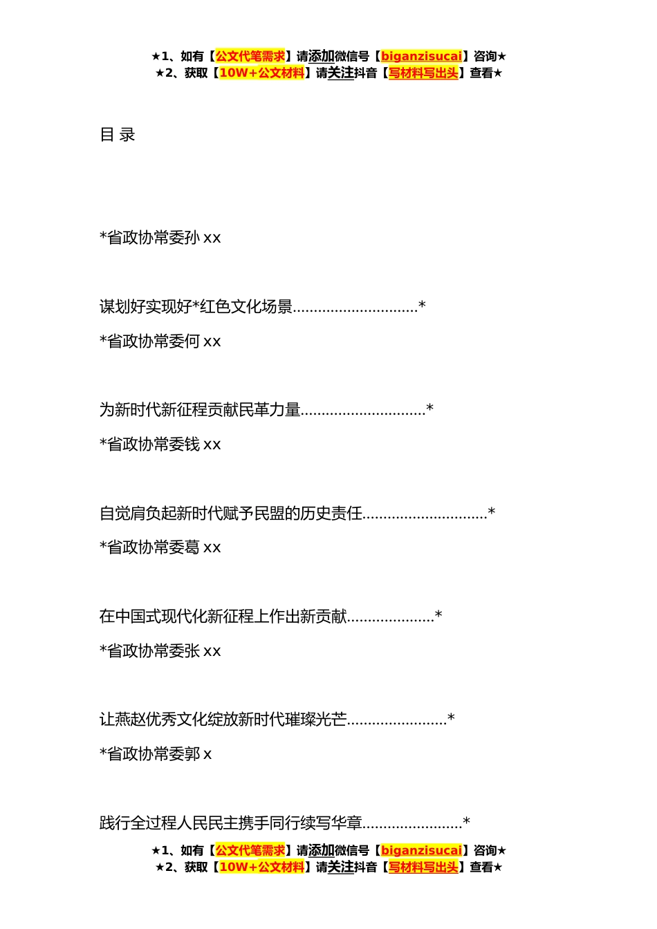 ★1、如有【公文代笔需求】请添加微信号【biganzisucai】咨询★★2、获取【10W+公文材料】请关注抖音【写材料写出头】查看★目录*省政协常委孙xx谋划好实现好*红色文化场景…………………………**省政协常委何xx为新时代新征程贡献民革力量…………………………**省政协常委钱xx自觉肩负起新时代赋予民盟的历史责任…………………………**省政协常委葛xx在中国式现代化新征程上作出新贡献…………………**省政协常委张xx让燕赵优秀文化绽放新时代璀璨光芒……………………**省政协常委郭x践行全过程人民民主携手同行续写华章……………………*★1、如有【公文代笔需求】请添加微信号【biganzisucai】咨询★★2、获取【10W+公文材料】请关注抖音【写材料写出头】查看★★1、如有【公文代笔需求】请添加微信号【biga...