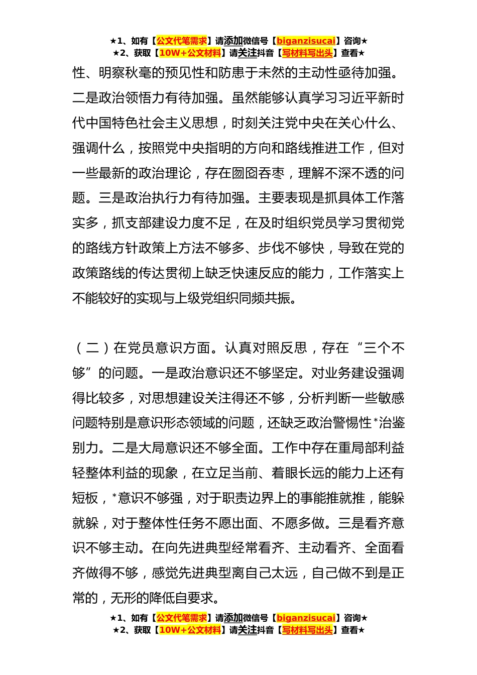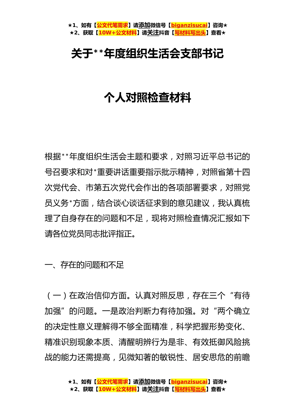 ★1、如有【公文代笔需求】请添加微信号【biganzisucai】咨询★★2、获取【10W+公文材料】请关注抖音【写材料写出头】查看★关于**年度组织生活会支部书记个人对照检查材料根据**年度组织生活会主题和要求,对照习近平总书记的号召要求和对*重要讲话重要指示批示精神,对照省第十四次党代会、市第五次党代会作出的各项部署要求,对照党员义务*方面,结合谈心谈话征求到的意见建议,我认真梳理了自身存在的问题和不足,现将对照检查情况汇报如下请各位党员同志批评指正。一、存在的问题和不足(一)在政治信仰方面。认真对照反思,存在三个“有待加强”的问题。一是政治判断力有待加强。对“两个确立的决定性意义理解得不够全面精准,科学把握形势变化、精准识别现象本质、清醒明辨行为是非、有效抵御风险挑战的能...