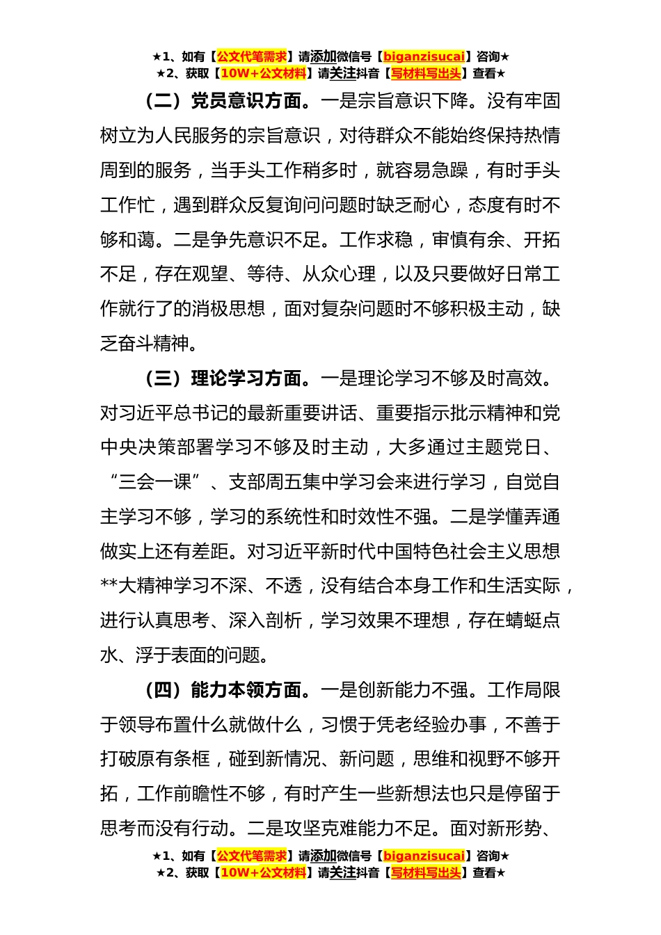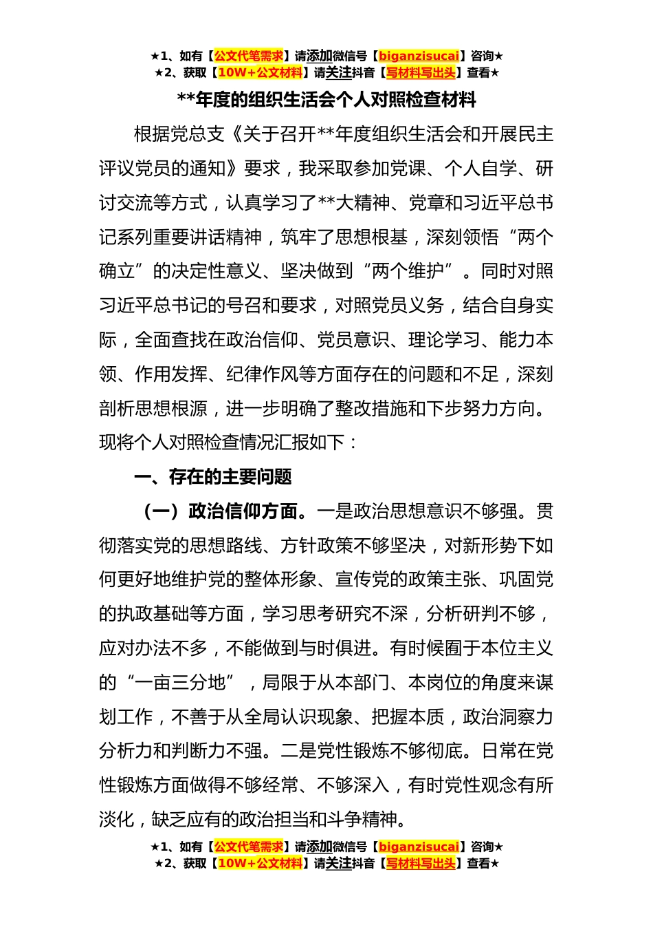 ★1、如有【公文代笔需求】请添加微信号【biganzisucai】咨询★★2、获取【10W+公文材料】请关注抖音【写材料写出头】查看★**年度的组织生活会个人对照检查材料根据党总支《关于召开**年度组织生活会和开展民主评议党员的通知》要求,我采取参加党课、个人自学、研讨交流等方式,认真学习了**大精神、党章和习近平总书记系列重要讲话精神,筑牢了思想根基,深刻领悟“两个确立”的决定性意义、坚决做到“两个维护”。同时对照习近平总书记的号召和要求,对照党员义务,结合自身实际,全面查找在政治信仰、党员意识、理论学习、能力本领、作用发挥、纪律作风等方面存在的问题和不足,深刻剖析思想根源,进一步明确了整改措施和下步努力方向。现将个人对照检查情况汇报如下:一、存在的主要问题(一)政治信仰方面...
