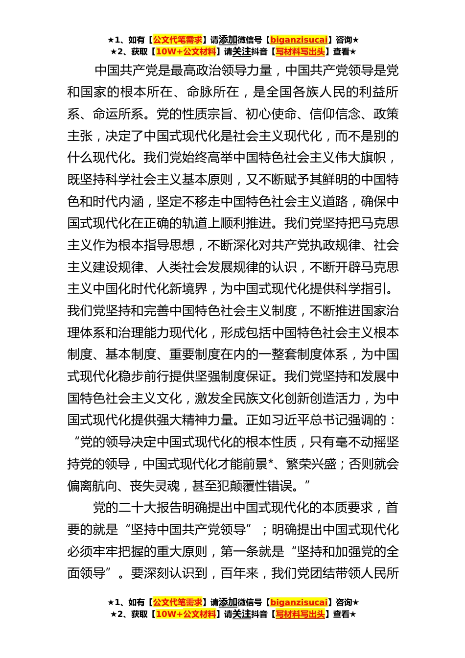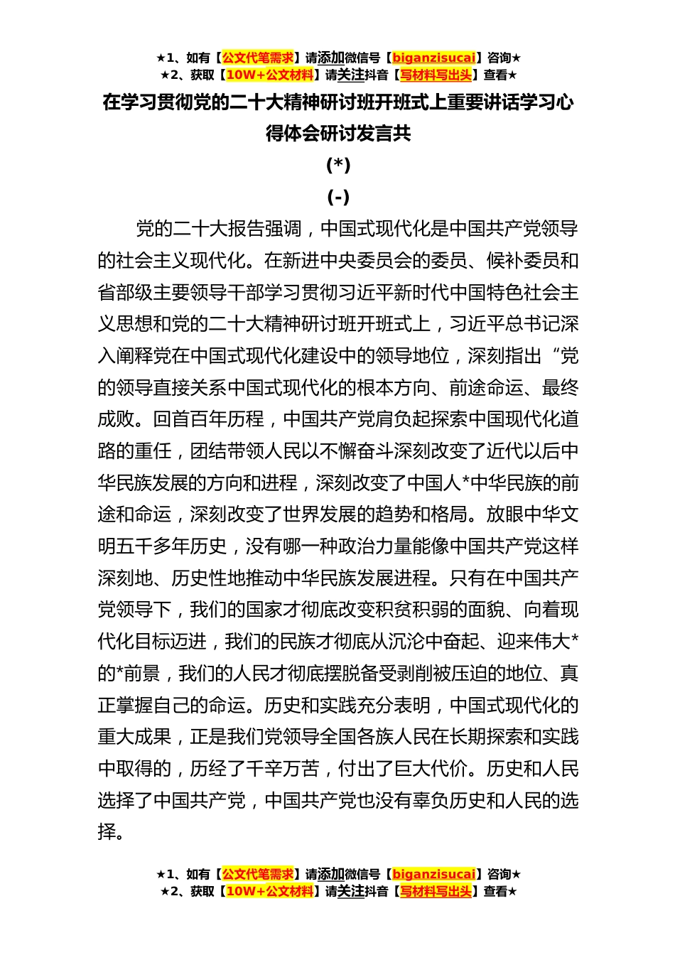 ★1、如有【公文代笔需求】请添加微信号【biganzisucai】咨询★★2、获取【10W+公文材料】请关注抖音【写材料写出头】查看★在学习贯彻党的二十大精神研讨班开班式上重要讲话学习心得体会研讨发言共(*)(-)党的二十大报告强调,中国式现代化是中国共产党领导的社会主义现代化。在新进中央委员会的委员、候补委员和省部级主要领导干部学习贯彻习近平新时代中国特色社会主义思想和党的二十大精神研讨班开班式上,习近平总书记深入阐释党在中国式现代化建设中的领导地位,深刻指出“党的领导直接关系中国式现代化的根本方向、前途命运、最终成败。回首百年历程,中国共产党肩负起探索中国现代化道路的重任,团结带领人民以不懈奋斗深刻改变了近代以后中华民族发展的方向和进程,深刻改变了中国人*中华民族的前途和命运...