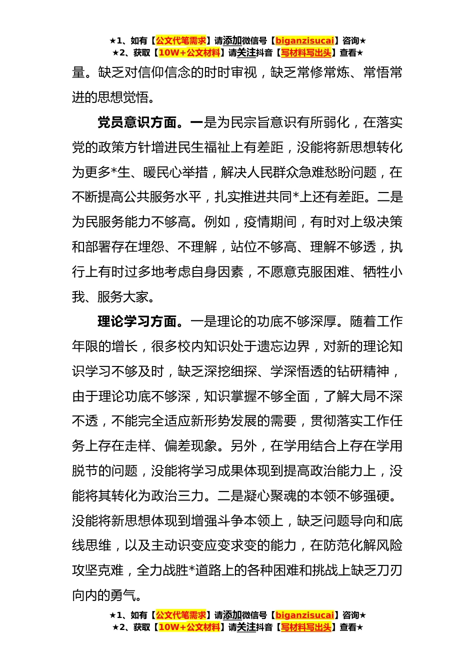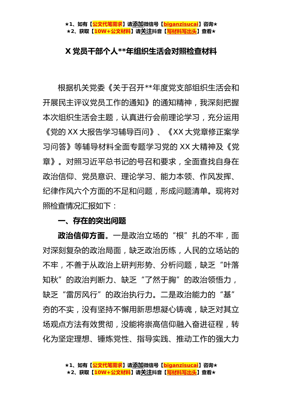 ★1、如有【公文代笔需求】请添加微信号【biganzisucai】咨询★★2、获取【10W+公文材料】请关注抖音【写材料写出头】查看★X党员干部个人**年组织生活会对照检查材料根据机关党委《关于召开**年度党支部组织生活会和开展民主评议党员工作的通知》的通知精神,我深刻把握本次组织生活会主题,认真进行会前理论学习,充分运用《党的XX大报告学习辅导百问》、《XX大党章修正案学习问答》等辅导材料全面专题学习党的XX大精神及《党章》。对照习近平总书记的号召和要求,全面查找自身在政治信仰、党员意识、理论学习、能力本领、作风发挥、纪律作风六个方面的不足和问题,形成问题清单。现将对照检查情况汇报如下:一、存在的突出问题政治信仰方面。一是政治立场的“根”扎的不牢,面对深刻复杂的政治局面,缺乏政治历...
