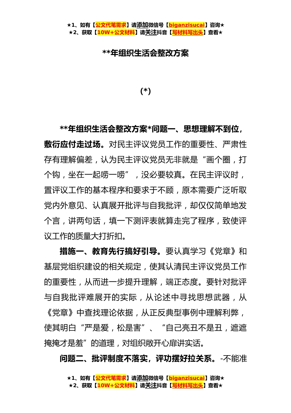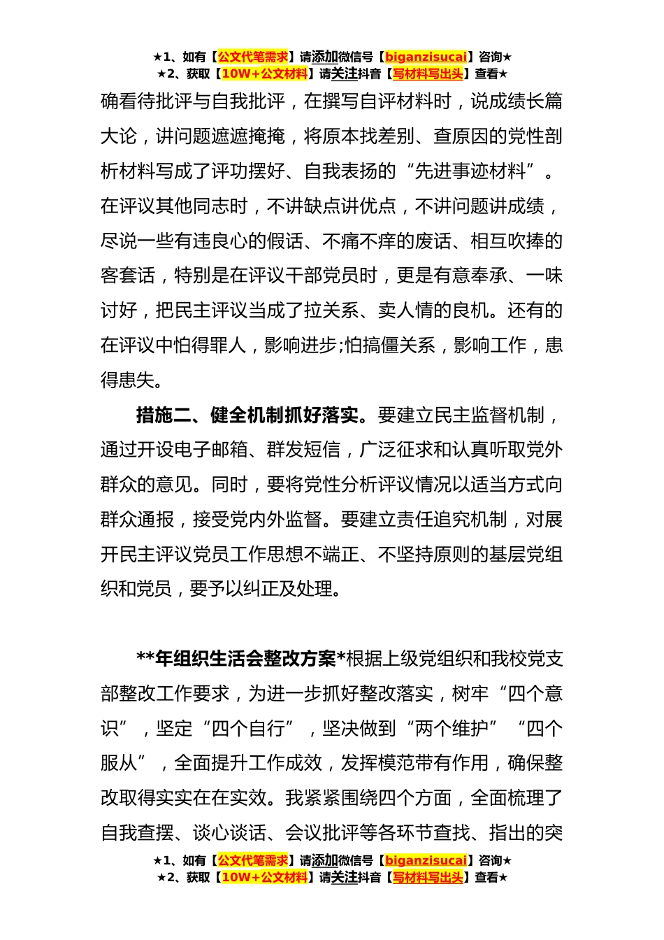 ★1、如有【公文代笔需求】请添加微信号【biganzisucai】咨询★★2、获取【10W+公文材料】请关注抖音【写材料写出头】查看★**年组织生活会整改方案(*)**年组织生活会整改方案*问题一、思想理解不到位,敷衍应付走过场。对民主评议党员工作的重要性、严肃性存有理解偏差,认为民主评议党员无非就是“画个圈,打个钩,坐在一起唠一唠”,没必要较真。在民主评议时,置评议工作的基本程序和要求于不顾,原本需要广泛听取党内外意见、认真展开批评与自我批评,却仅仅简单地发个言,讲两句话,填一下测评表就算走完了程序,致使评议工作的质量大打折扣。措施一、教育先行搞好引导。要认真学习《党章》和基层党组织建设的相关规定,使其认清民主评议党员工作的重要性,从而进一步提升理解,端正态度。要针对批评与自...