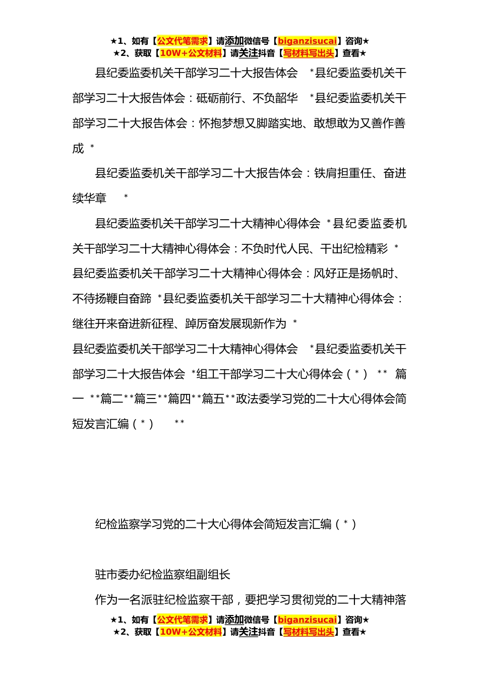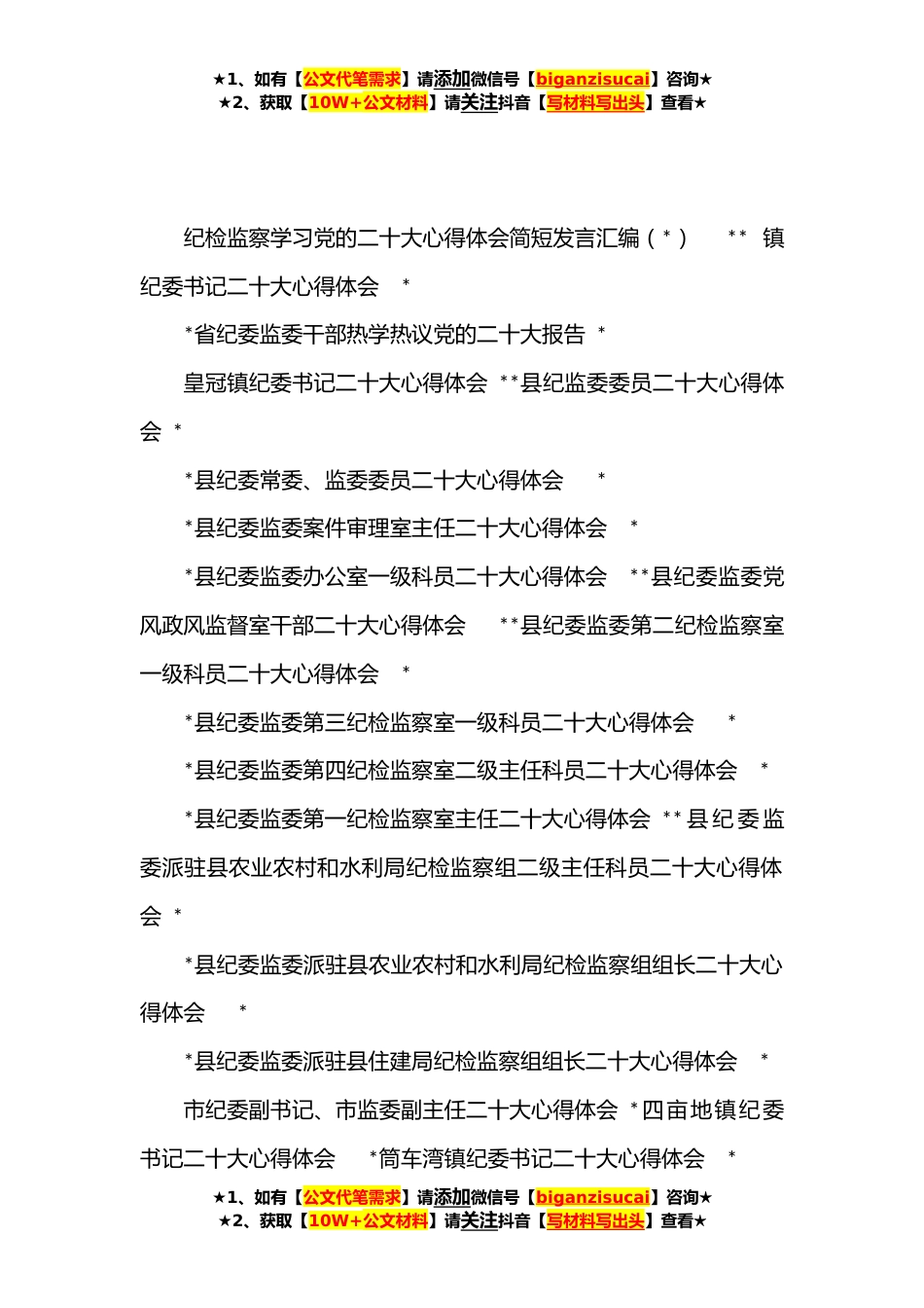 ★1、如有【公文代笔需求】请添加微信号【biganzisucai】咨询★★2、获取【10W+公文材料】请关注抖音【写材料写出头】查看★纪检监察学习党的二十大心得体会简短发言汇编(*)**镇纪委书记二十大心得体会**省纪委监委干部热学热议党的二十大报告*皇冠镇纪委书记二十大心得体会**县纪监委委员二十大心得体会**县纪委常委、监委委员二十大心得体会**县纪委监委案件审理室主任二十大心得体会**县纪委监委办公室一级科员二十大心得体会**县纪委监委党风政风监督室干部二十大心得体会**县纪委监委第二纪检监察室一级科员二十大心得体会**县纪委监委第三纪检监察室一级科员二十大心得体会**县纪委监委第四纪检监察室二级主任科员二十大心得体会**县纪委监委第一纪检监察室主任二十大心得体会**县纪委监委派驻县农业农村...